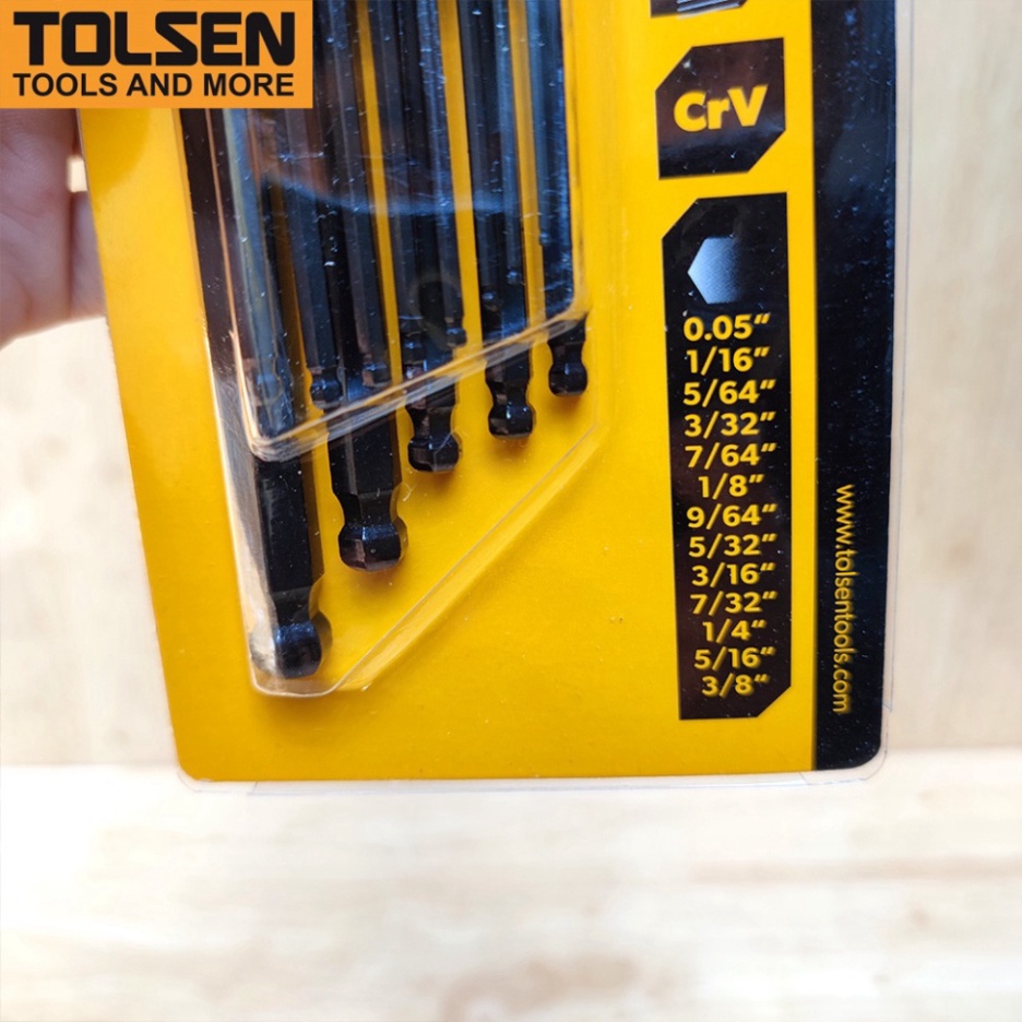 - Bộ lục giác đầu bi Tolsen 20090 gồm 13 cây với các kích cỡ khác nhau: 0.05“-1/16”-5/64“-3/32”-7/64“-1/8”-9/64“-5/32”-3/16“-7/32”-1/4“-5/16”-3/8“