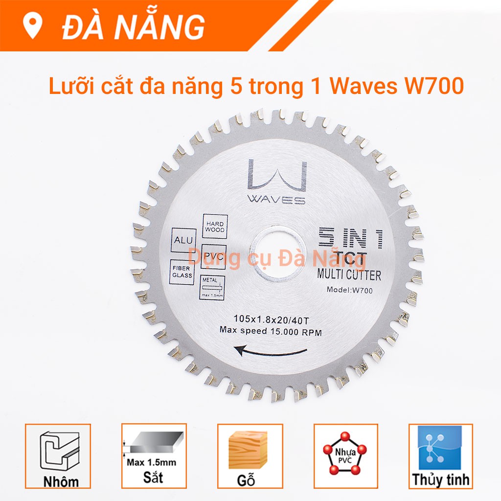 Lưỡi cắt đa năng 5 in 1 Waves W700 105 x 1.8 x 20/40T là sản phẩm cao cấp sản xuất trên dây chuyền tiên tiến của hãng Waves theo tiêu chuẩn châu Âu. Sản phẩm đa dụng, chuyên dụng cắt 5 loại vật liệu : sắt độ dày tối đalà 1.5mm, nhựa PVC, gỗ, thủy tinh và nhôm.