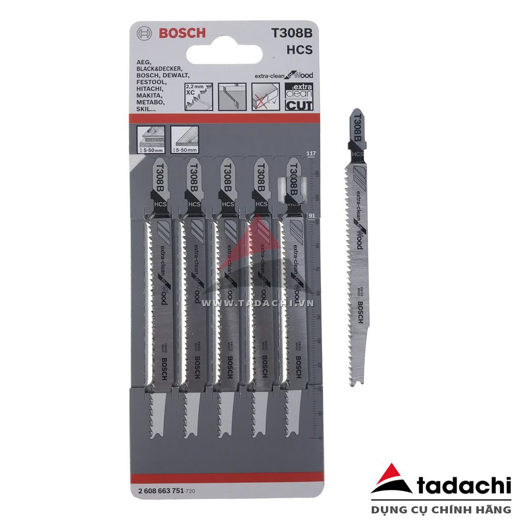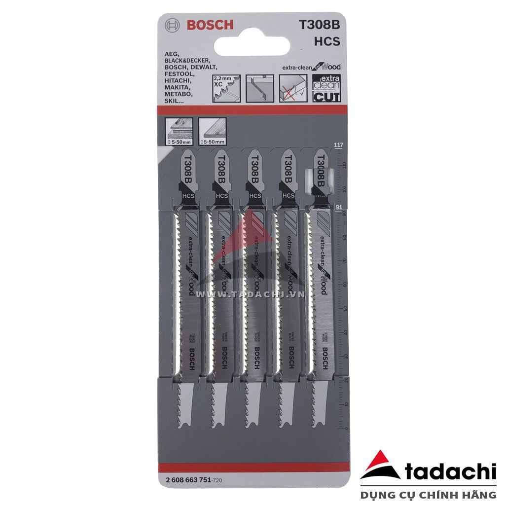 - Lưỡi cưa lọng cắt gỗ siêu mịn T308B Bosch 2608663751- Thiết kế răng cưa dạng tiện, sắc bén kèm với bước răng mịn 2.2mm và bảng lưỡi cưa lớn 9.5mm nên thích hợp cắt thẳng, cắt nhanh trên vật liệu gỗ mềm và ván ép từ 5-50mm cho đường cắt đẹp và mịn.