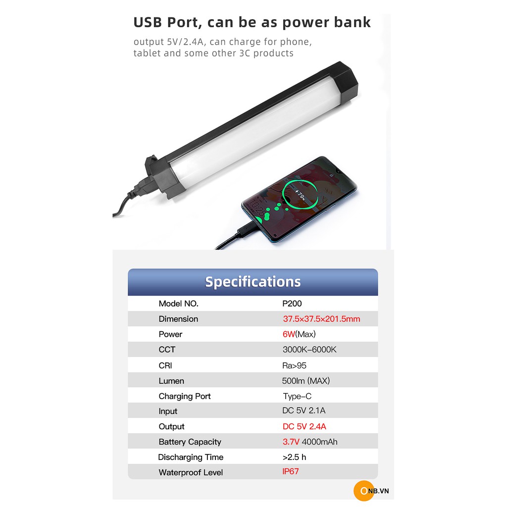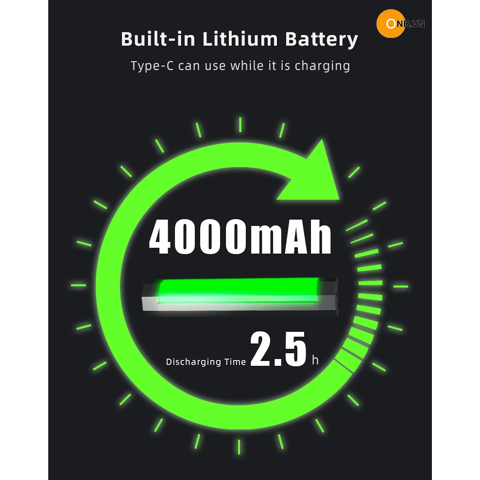 Pin sạc tích hợp 4000mAh 3.7V cổng Type-C - cho thời gian sử dụng 2.5h - 6h tiếng tùy mức độ sáng. Ngoài ra dùng làm sạc dự phòng.