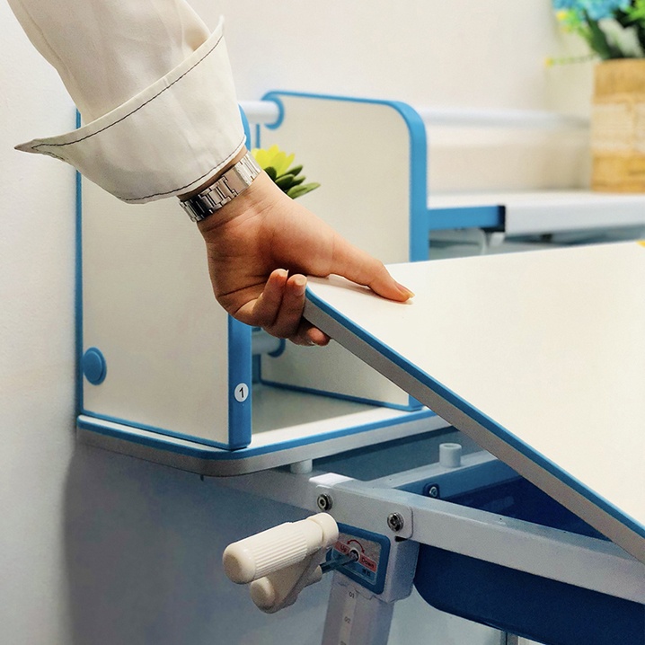 - Độ nghiêng mặt bàn dễ dàng điều chỉnh từ 0~45 độ, phù hợp với cả 4 tư thế ngồi của bé: viết bài – đọc sách – vẽ tranh – chơi đồ chơi;