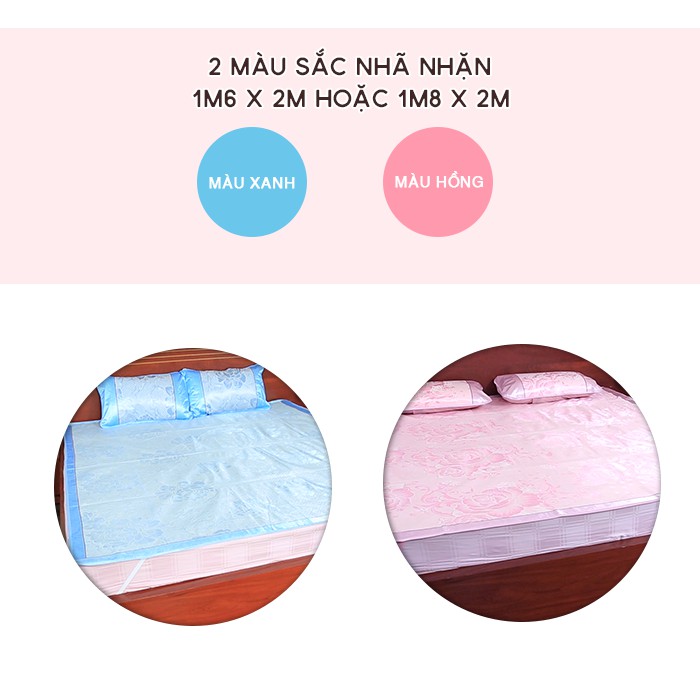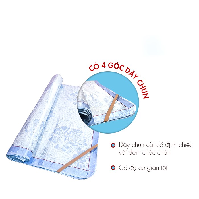 Vải lụa có đặc tính mềm, co giãn tốt, độ hút ẩm cao không gây hại cho làn da, không ẩm mốc. Mặt dưới chiếu có 4 góc dây chun cài cố định chiếu với đệm chắc chắn và có độ co giãn tốt