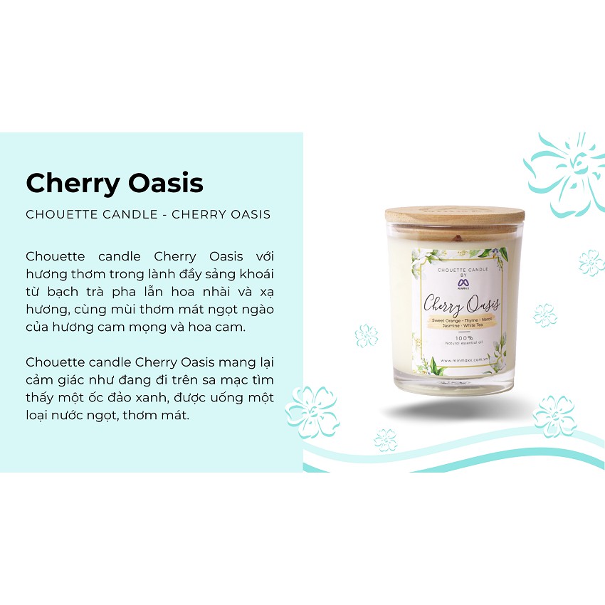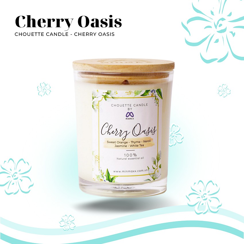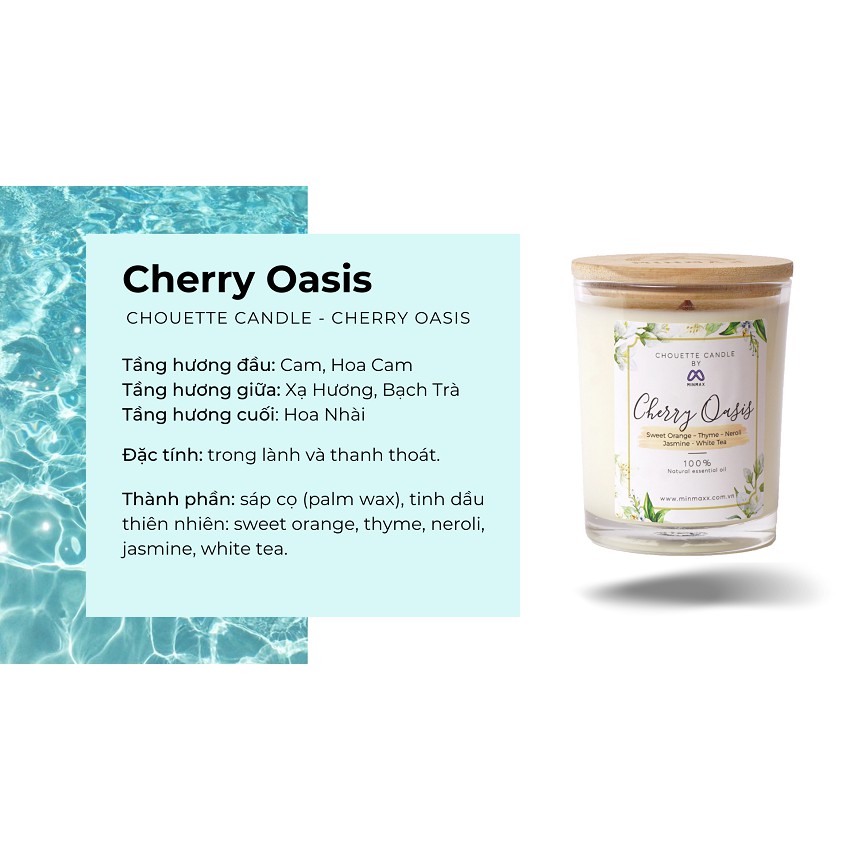 Cherry Oasis với hương thơm trong lành đầy sảng khoái từ bạch trà pha lẫn hoa nhài và xạ hương, cùng mùi thơm mát ngọt ngào của hương cam mọng và hoa cam. Nến Cherry Oasis mang lại cảm giác như đang đi trên sa mạc tìm thấy một ốc đảo xanh, được uống một loại nước ngọt, thơm mát. Mùi hương thơm mát, sảng khoái, thư giãn.
