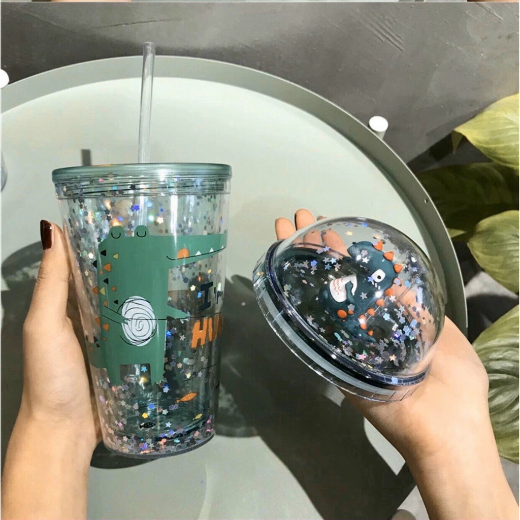 Giới thiệu Ly Pha Lê 2 Lớp Cách Nhiệt Hình Khủng Long Siêu Xinh - Bình Đựng Nước, Trà Sữa Nhũ Kim Tuyến