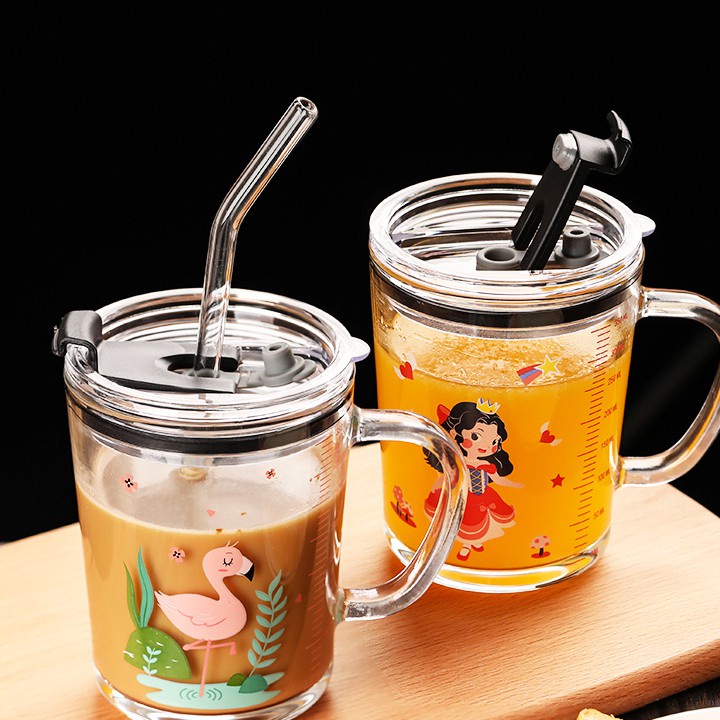Ly Thuỷ Tinh Chia Vạch Chia Mực Nước Có Nắp Chống Đổ ( Tặng Kèm Ống Hút Silicon )