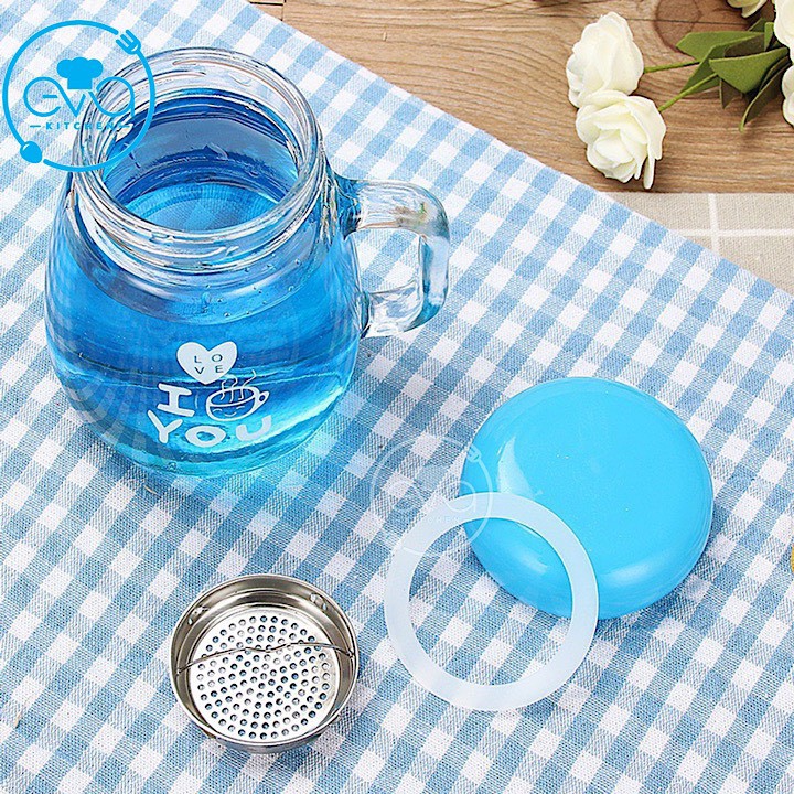 Giới thiệu Ly Thuỷ Tinh Có Quai Cầm Kèm Lưới Lọc Trà Inox Kiểu Dáng Penguin Nắp Màu 350 Ml