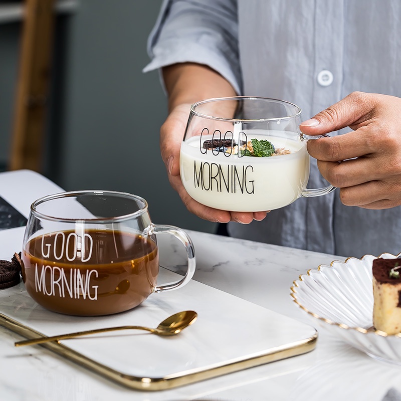 Nhà cửa & Đời sống > Dụng cụ nhà bếp > Dụng cụ pha trà, cà phê || Ly thủy tinh dễ thương uống nước cute GOOD MORNING 350 ml Cốc thủy tinh chịu nhiệt có quai ABUSTORE H19Còn hàng