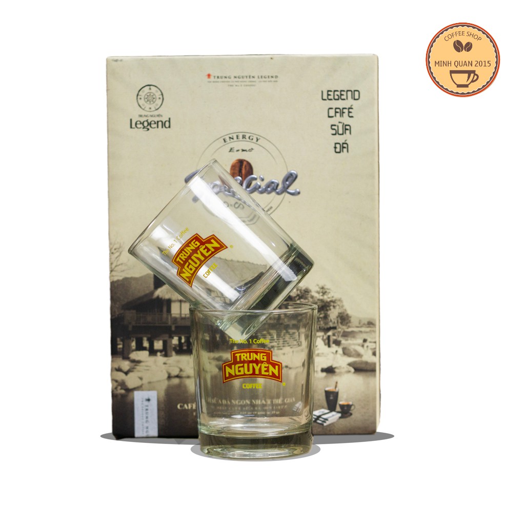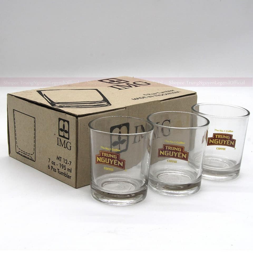 Bộ 06 ly thủy tinh logo Trung Nguyên cao cấp thường được dùng để phục vụ thức uống cà phê, trà, nước hoa quả cho quán, ly uống nước dành cho gia đình.