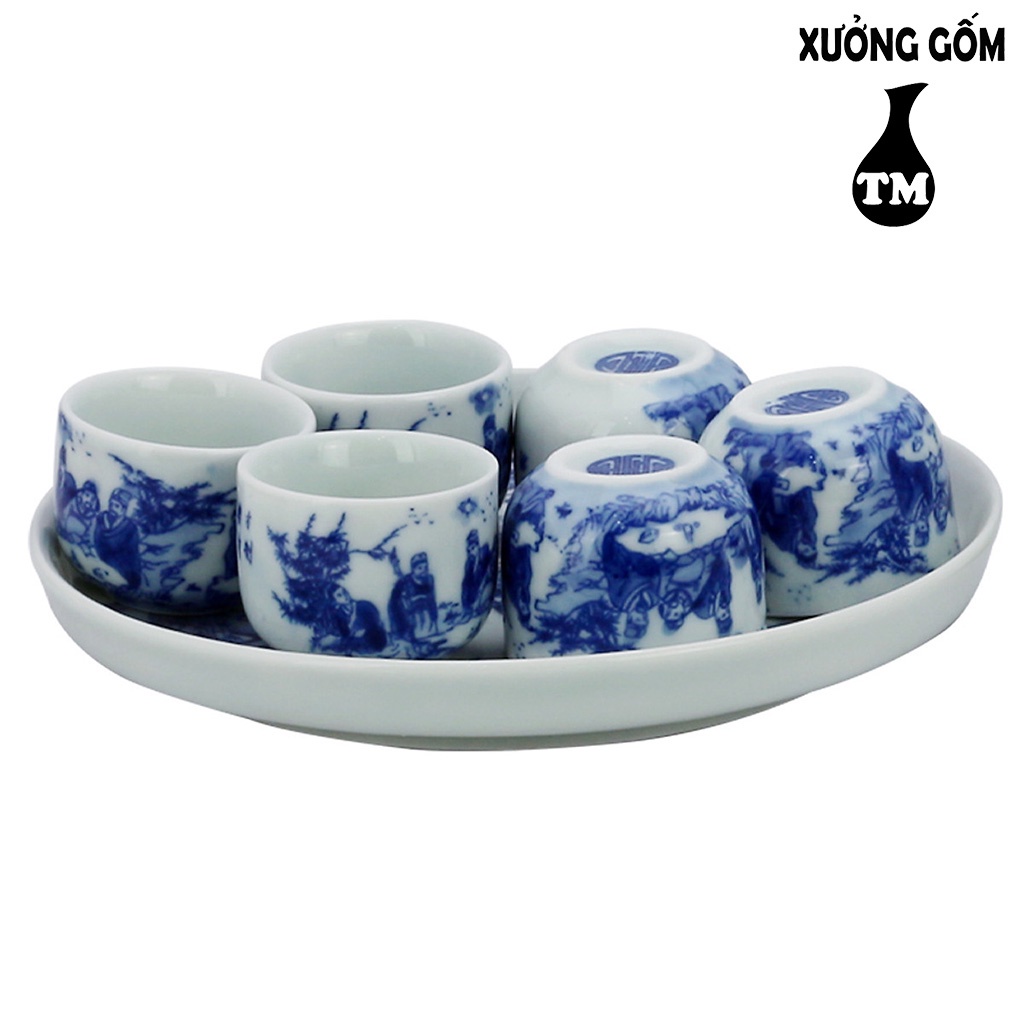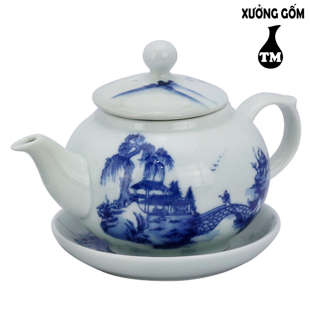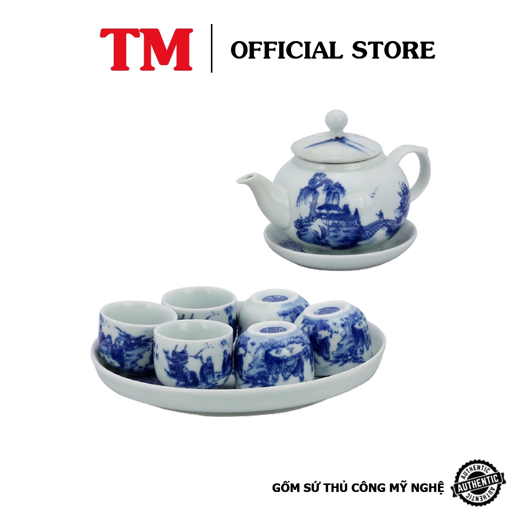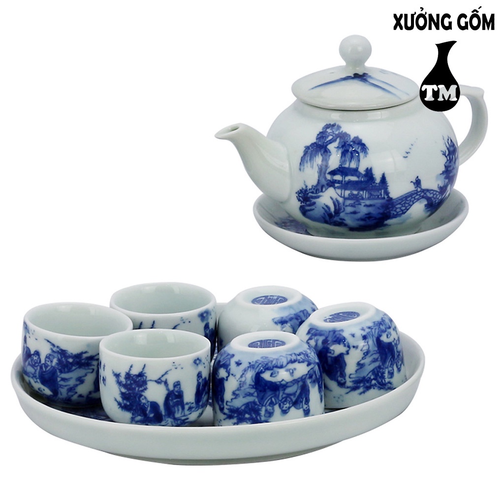Bộ Ấm Chén Men Lam Bưởi Khay Vẽ Phong Cảnh Xưởng Gốm TM Bát Tràng