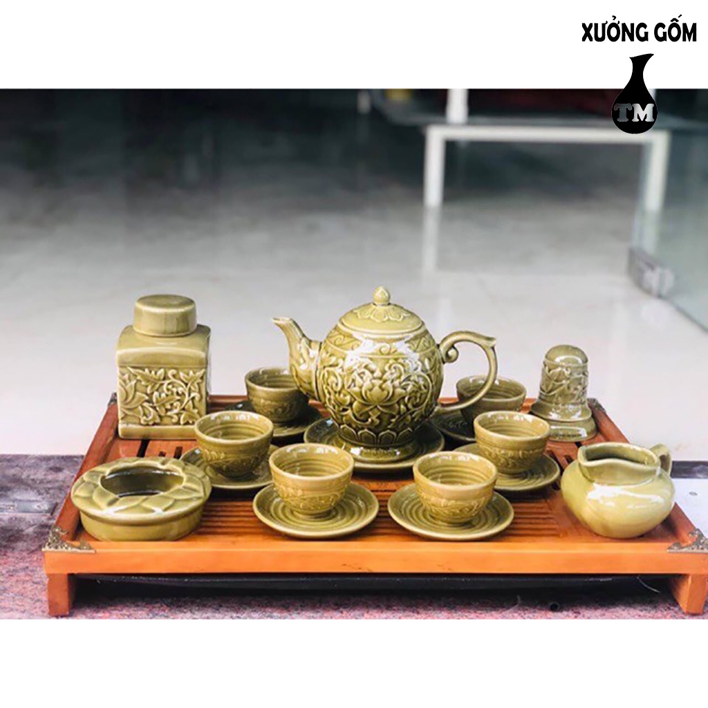 Bộ Ấm Chén Men Ngọc Hoa Sen Khắc Nổi Xưởng Gốm TM Bát Tràng - 700ml