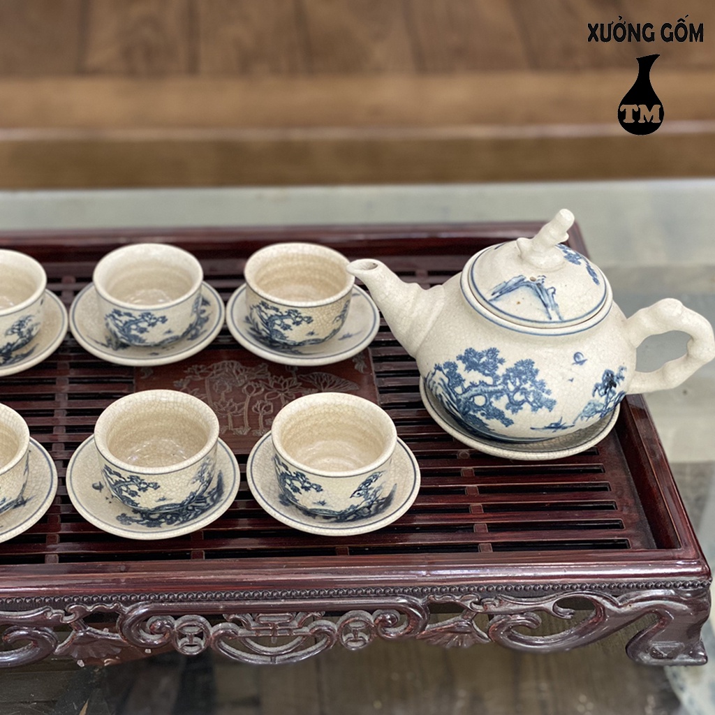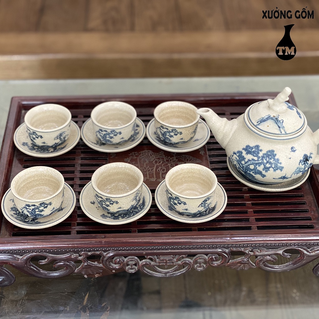 Bộ Ấm Chén Men Rạn Xưởng Gốm TM Bát Tràng Họa Tiết Vẽ Tùng Chùa – 500ML