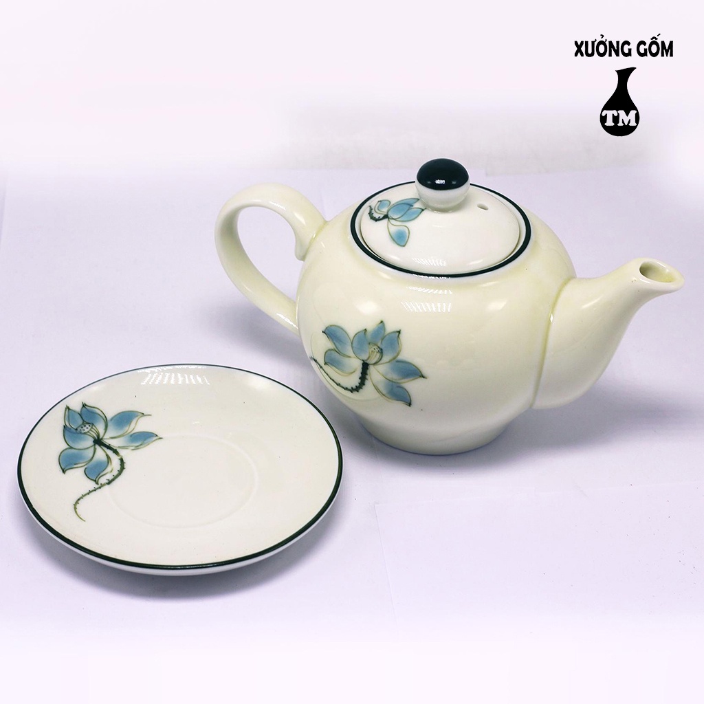 Bộ Ấm Chén Pha Uống Trà Men Kem Họa Tiết Vẽ Hoa Đào Xanh Xưởng Gốm TM Bát Tràng( bộ bình trà, uống trà)