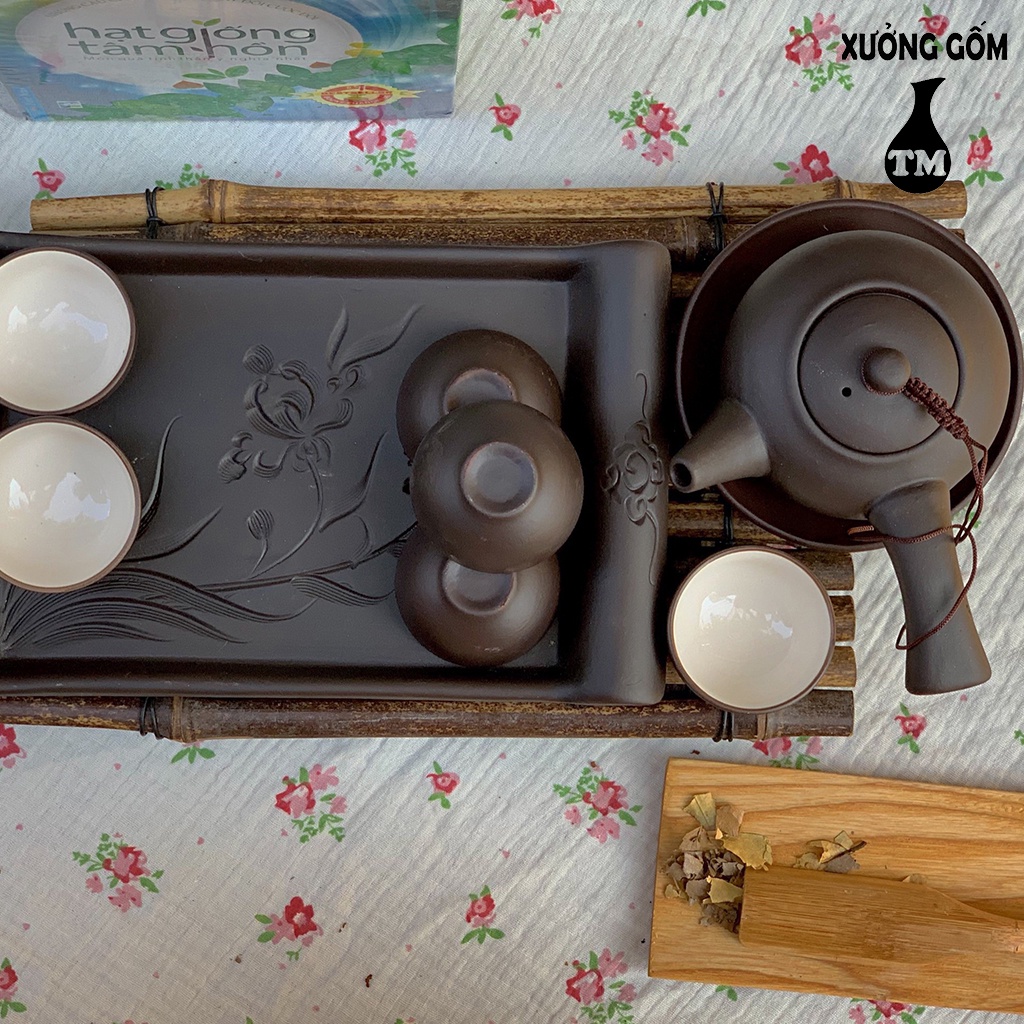 - Bộ bình trà Tử Sa ( Ấm chén Tử Sa) khay lá với những chạm khảm tỉ mỉ mang đường nét cổ điển, độc đáo kết hợp cùng gam màu mộc mạc, sang trọng, sẽ là một món quà tuyệt vời để bạn dành tặng đến người thân và bạn bè.