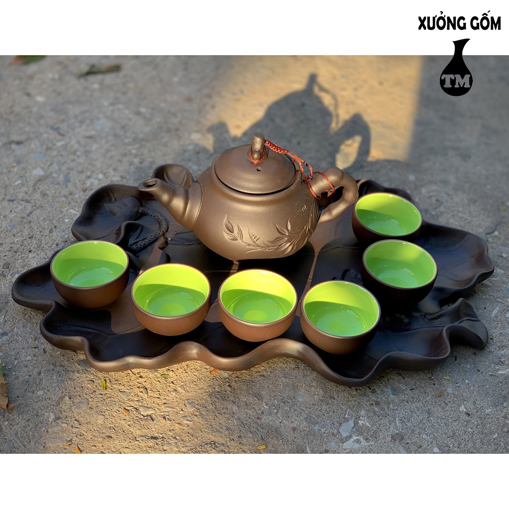 - Bộ bình trà Tử Sa ( Ấm chén Tử Sa) khay lá với những chạm khảm tỉ mỉ mang đường nét cổ điển, độc đáo kết hợp cùng gam màu mộc mạc, sang trọng, sẽ là một món quà tuyệt vời để bạn dành tặng đến người thân và bạn bè.