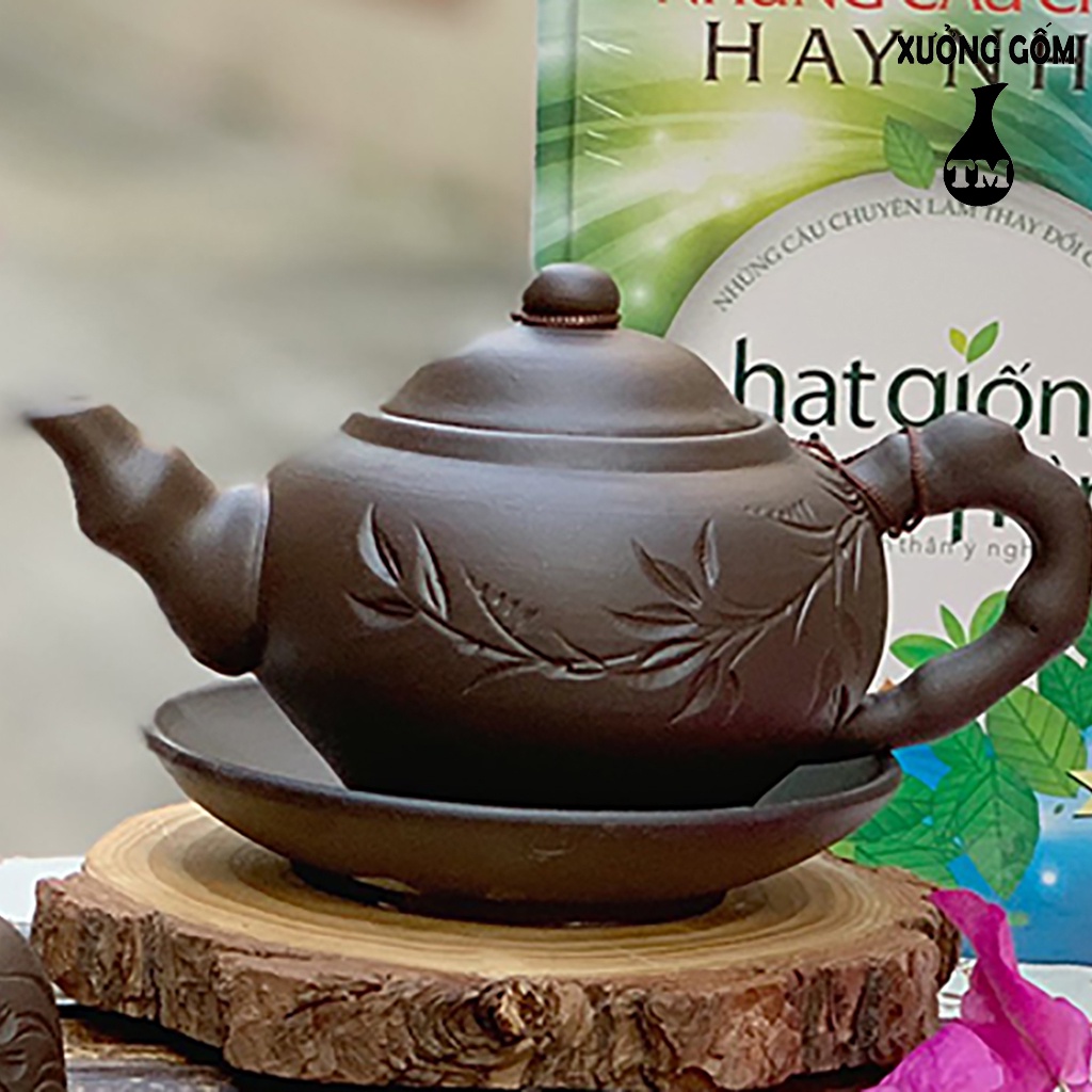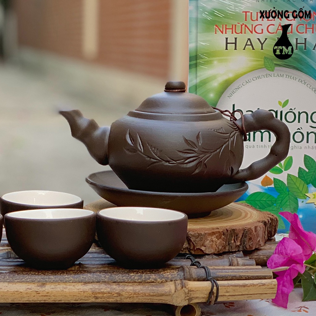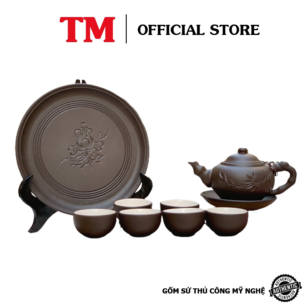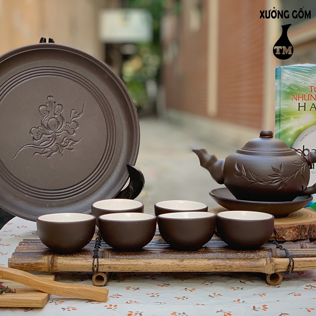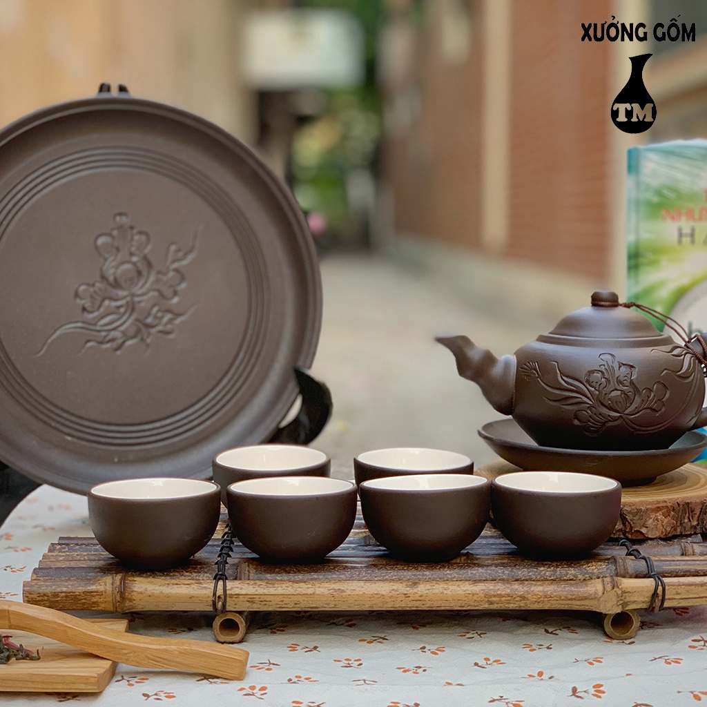 Bộ Ấm Chén Tử Sa Xưởng Gốm TM Bát Tràng Dáng Ấm Nhỡ Màu Đen Kèm Khay