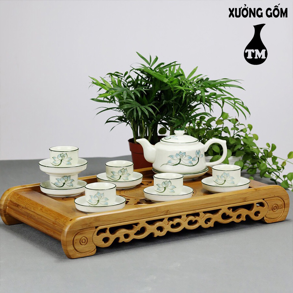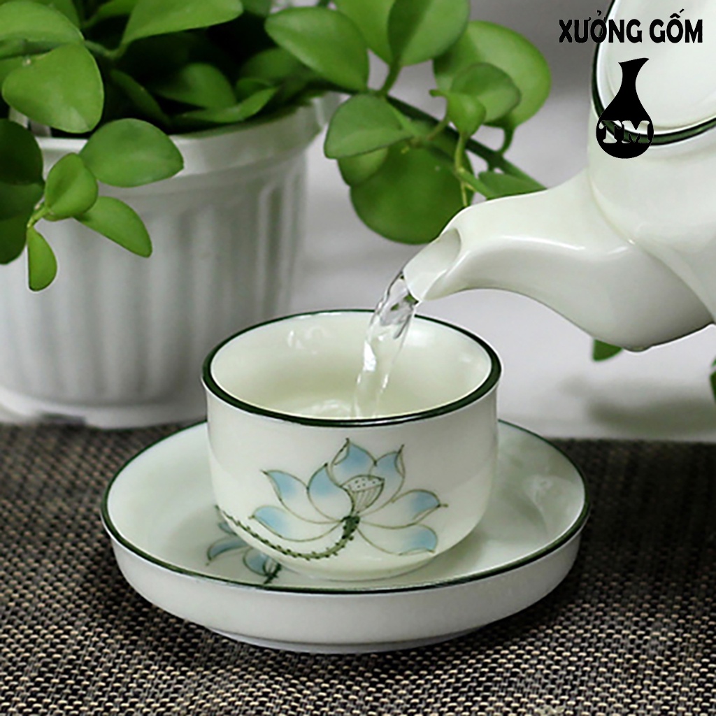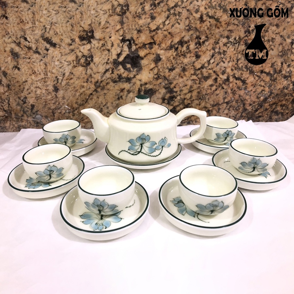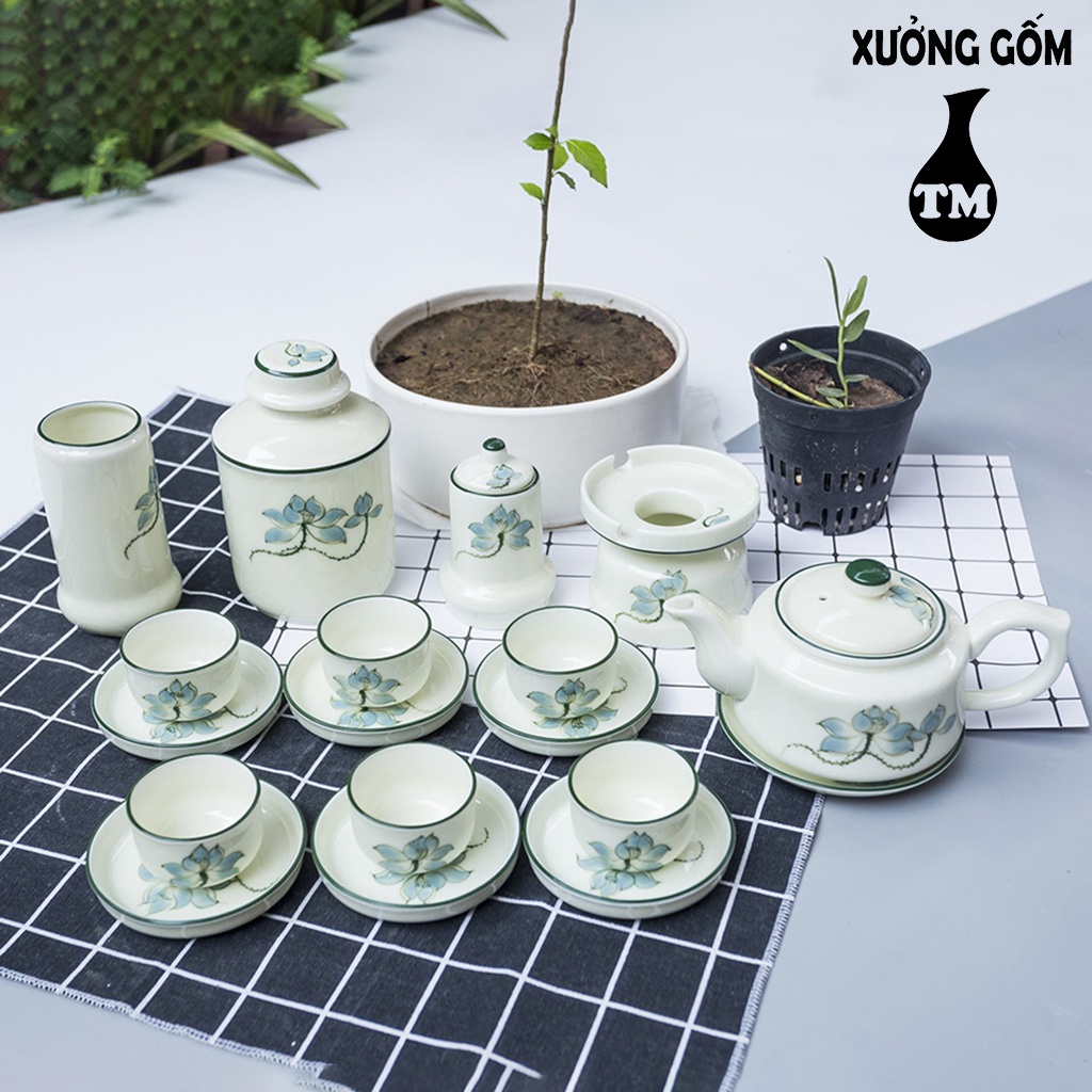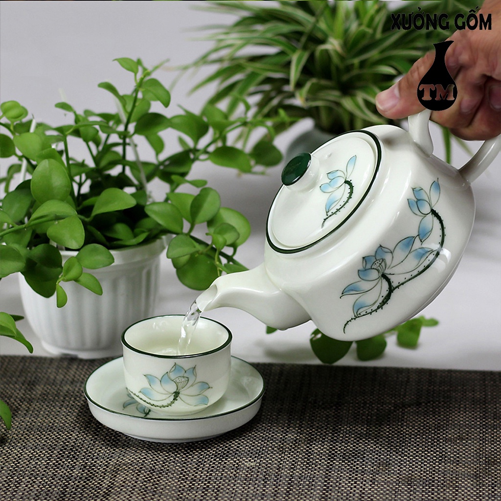 Bộ Ấm Chén Pha Trà Men Kem Họa Tiết Sen Xanh Xưởng Gốm TM Bát Tràng( bộ bình trà, uống trà)