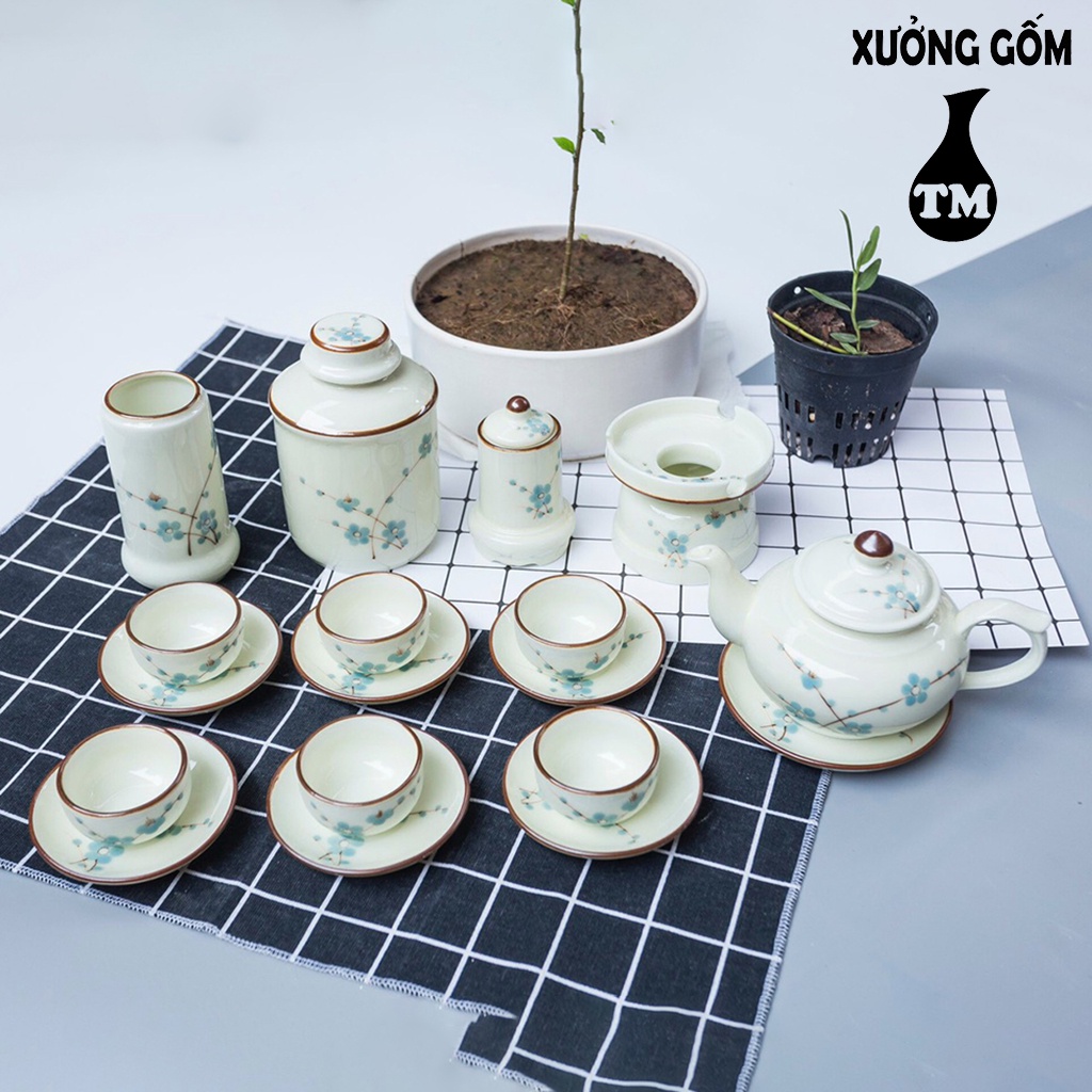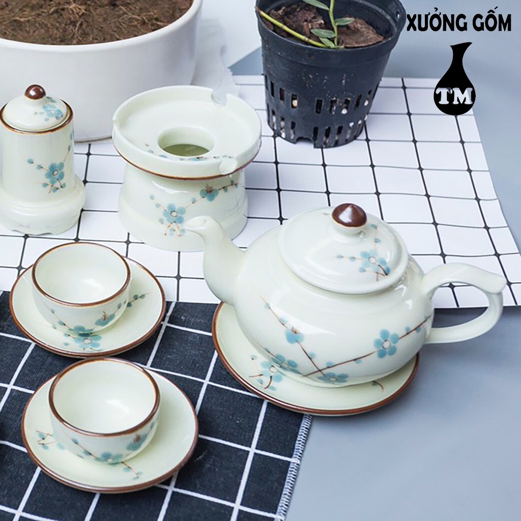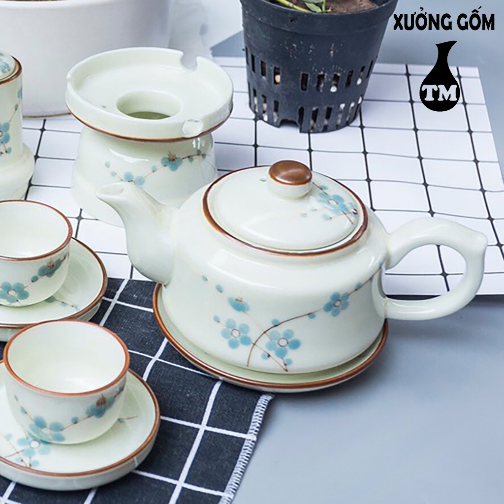Bộ Ấm Pha Trà Men Kem Họa Tiết Vẽ Hoa Đào Xanh Xưởng Gốm TM Bát Tràng( bộ bình trà, uống trà)