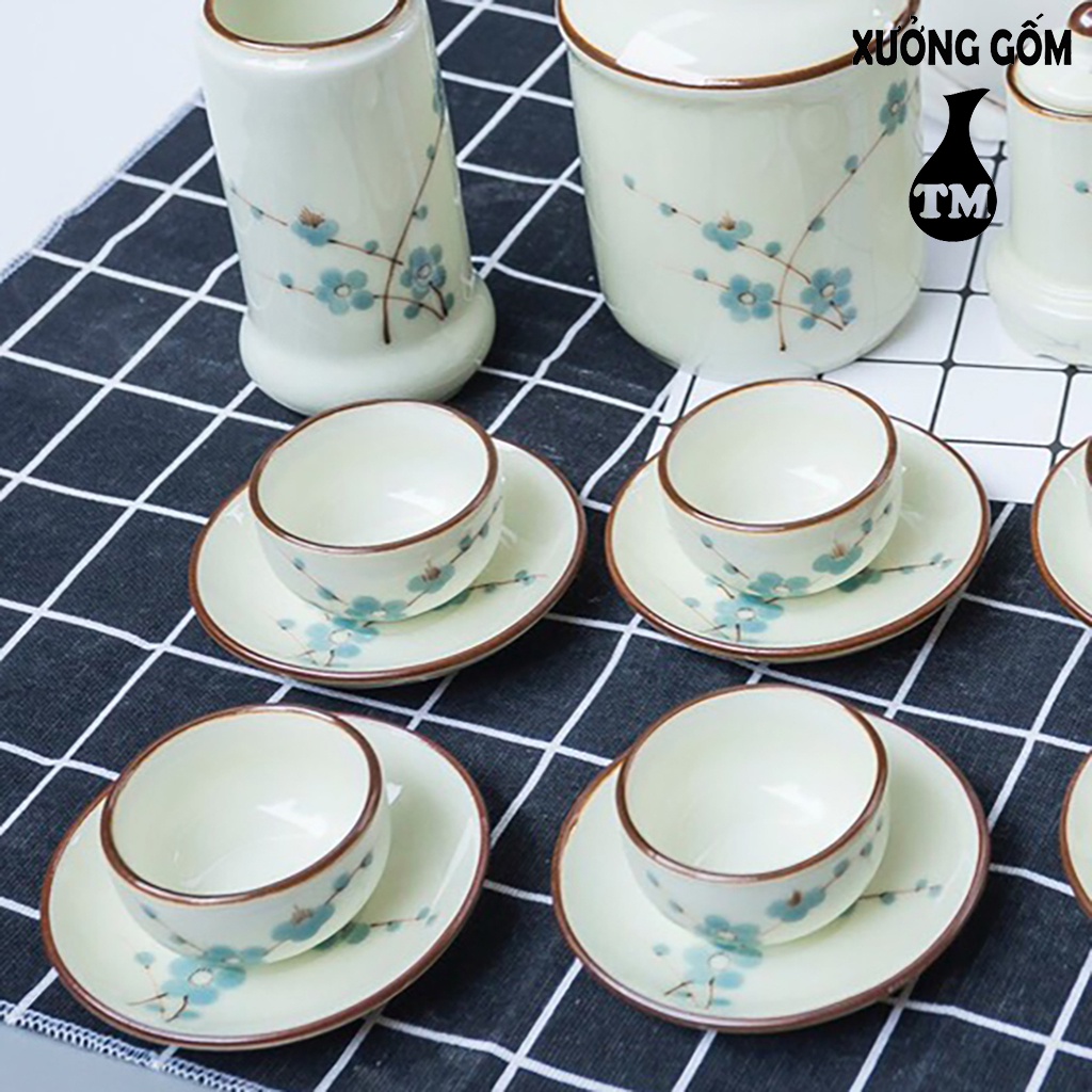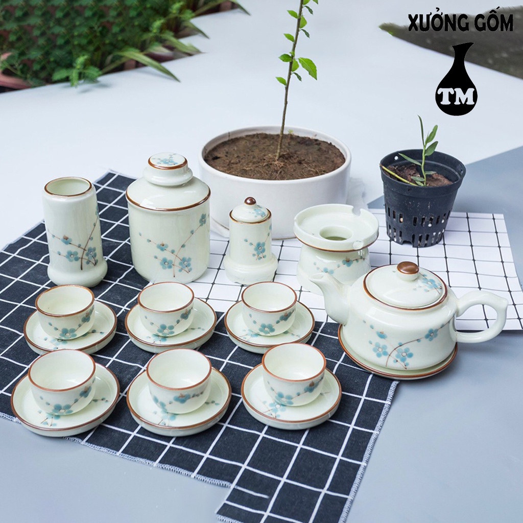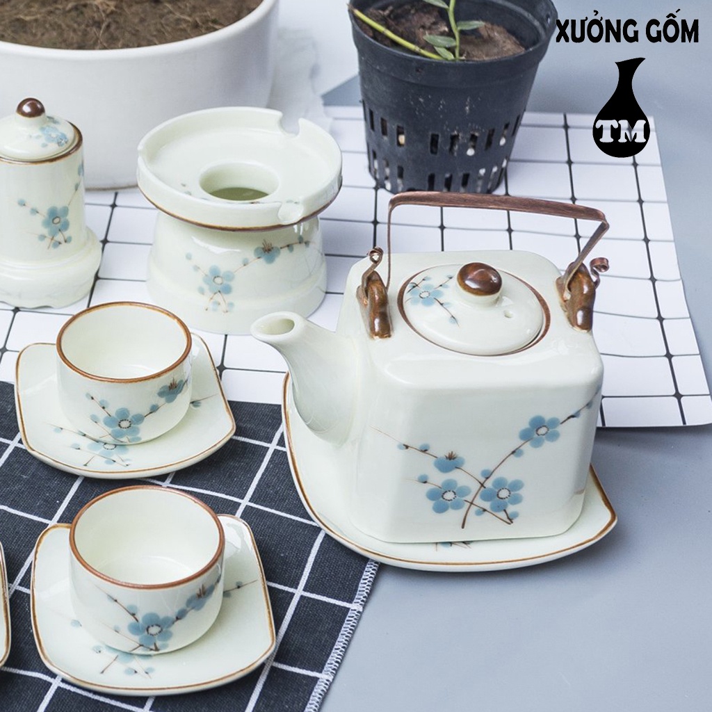 Bộ Ấm Pha Trà Men Kem Họa Tiết Vẽ Hoa Đào Xanh Xưởng Gốm TM Bát Tràng( bộ bình trà, uống trà)
