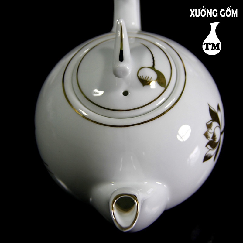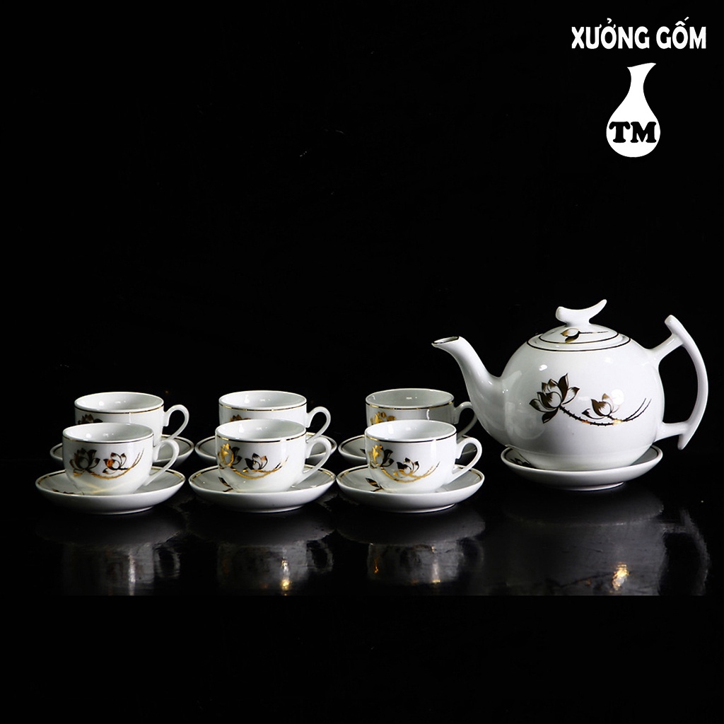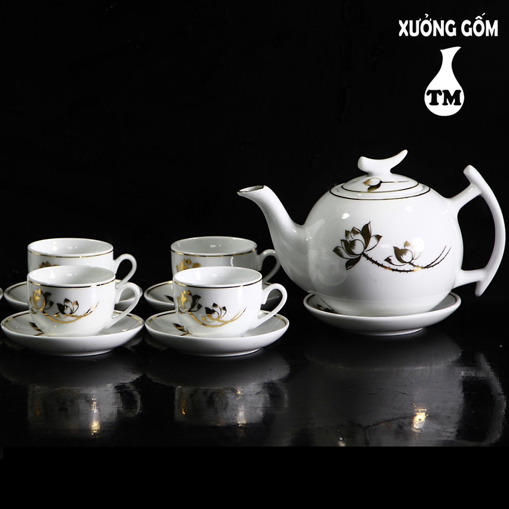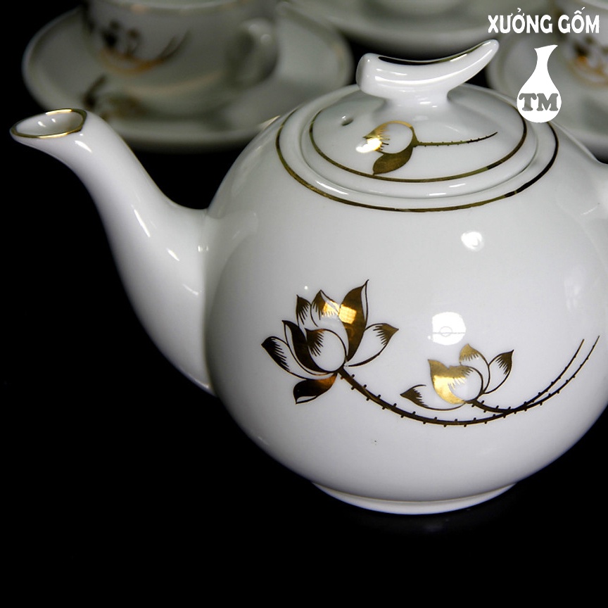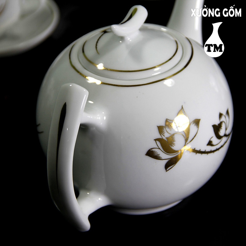 Bộ Ấm Pha Trà Men Trắng Vẽ Sen Vàng Kim, Bộ Ấm Pha Trà, Bộ Ấm Pha Trà Đẹp, Bộ Chén Trà Xưởng Gốm TM Bát Tràng