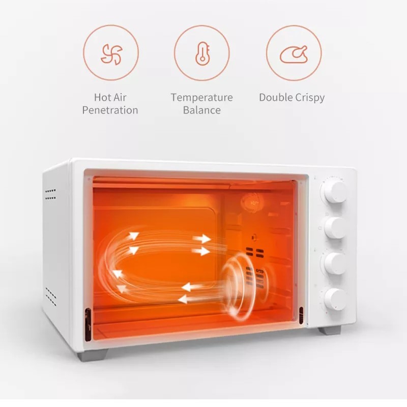 Lò nướng điện 32L Xiaomi Mijia XDE1 áp dụng công nghệ làm nóng đối lưu sử dụng quạt gió thổi luồng không khí qua 1 điện trở đốt nóng. Khi khởi động lò nướng, thanh điện trở sẽ được nung nóng đỏ lên tới nhiệt độ được cài sẵn và được quạt đẩy nhiệt lượng ra xung quanh giúp làm chín thực phẩm.