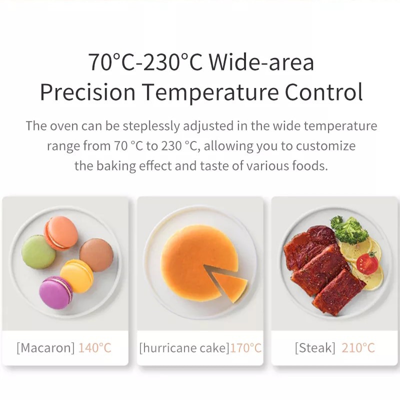 Vì các loại thực phẩm khác nhau sẽ có nhiệt độ nướng khác nhau, vì vậy nhà sản xuất đã trang bị một phạm vi nhiệt độ khá rộng cho lò nướng điện Xiaomi Mijia 32L từ 100ºC đến 230ºC. Người dùng có thể linh hoạt điều chỉnh nhiệt độ nướng theo từng thực phẩm, giúp làm chín thực phẩm nhanh hơn. Cụ thể nhà sản xuất gợi ý một số thời gian nướng các thực phẩm như xúc xích, bánh mì, cá, burger, ngô, pizza, thịt xiên, và bánh ngọt.