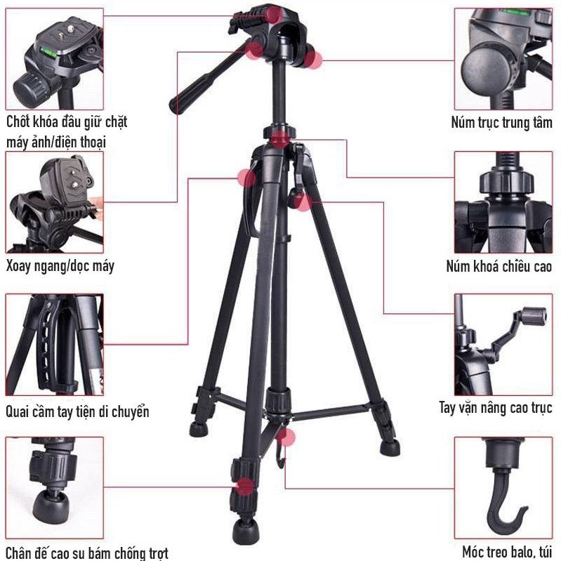 Chân máy ảnh, tripod Weifeng WT-3520, khung nhôm cao cấp, tặng kèm kẹp điện thoạiThông tin sản phẩm: