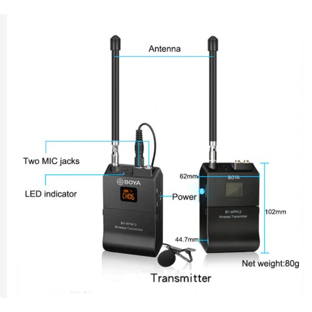 - Bộ micro không dây boya BY-WFM12 được trang bị sóng VHF dải tần riêng với 12 kênh sóng, cho khả năng ổn định tín hiệu cao, không bị lẫn sóng hoặc suy hao tín hiệu.