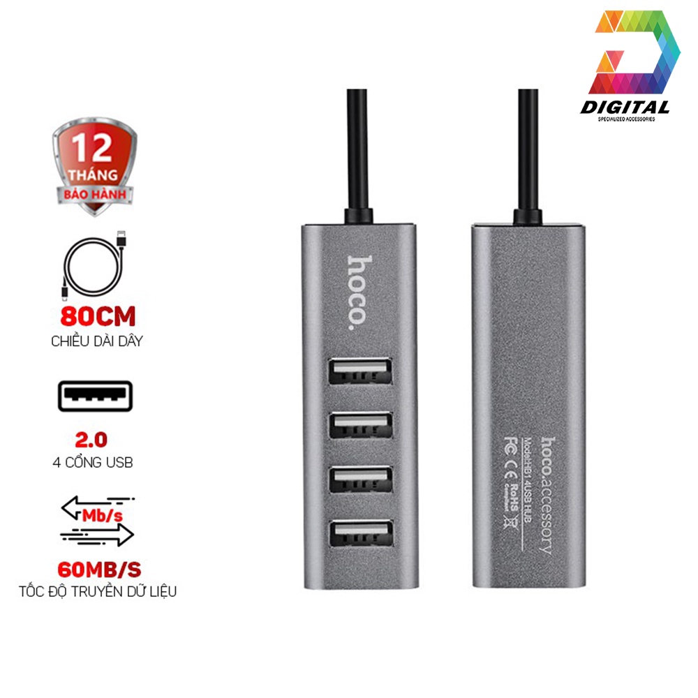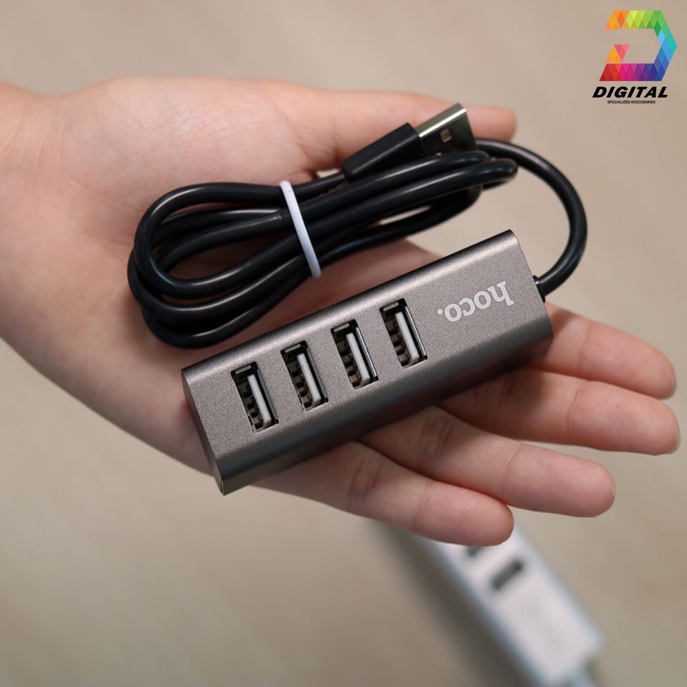 - Hub USB Hoco HB1 với 4 cổng USB 2.0 và một đầu USB để kết nối với cổng USB trên máy tính. Hoco HB1 hỗ trợ chia cổng usb trên máy tính thành 4 cổng usb trên hub. Ngoài việc hỗ trợ truyền dữ liệu thì Hub còn giúp bạn kết nối với những thiết bị sử dụng cổng USB khác. Như quạt tản nhiệt, USB, chuột, lót chuột rgp, fan mini, đầu đọc thẻ nhớ…