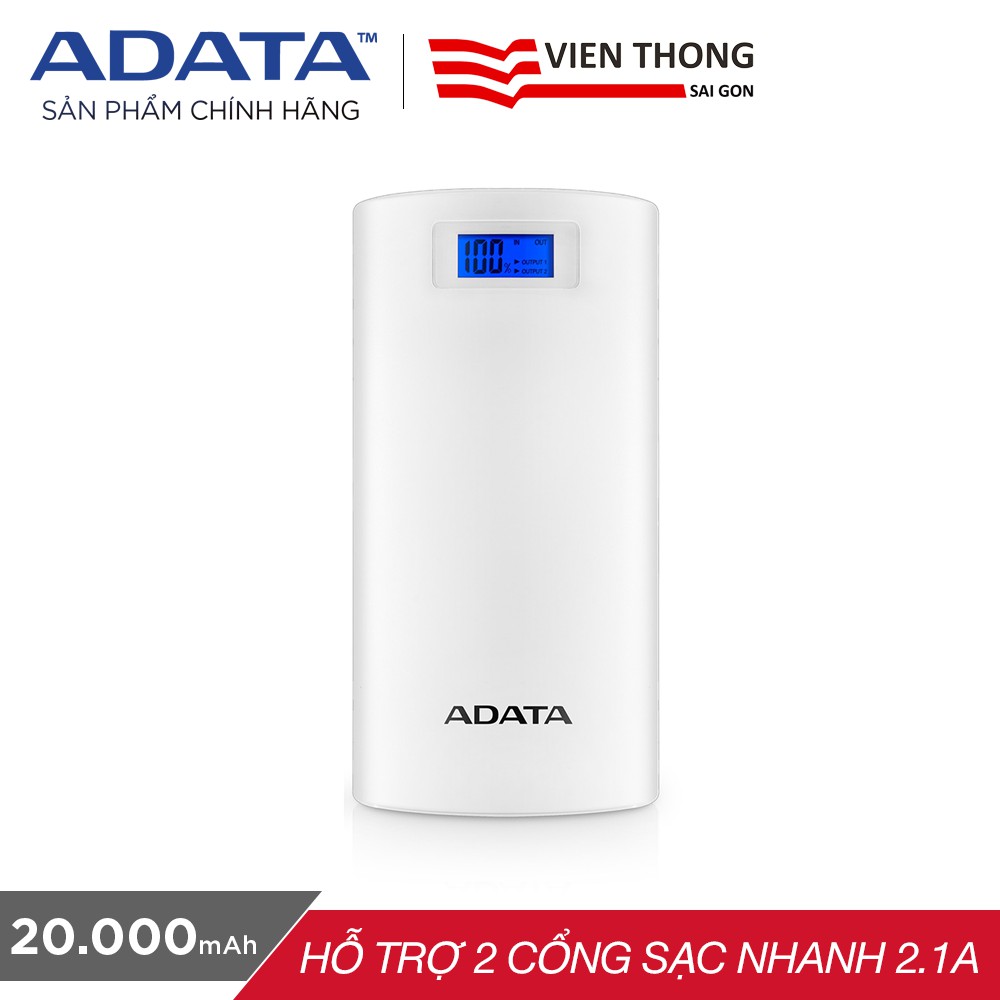 Điện Thoại & Phụ Kiện > Pin sạc dự phòng > 10000 - 20000mAh || Pin sạc dự phòng 20000mAh P20000D ADATA (trắng) - Hãng phân phối chính thứcCòn hàng