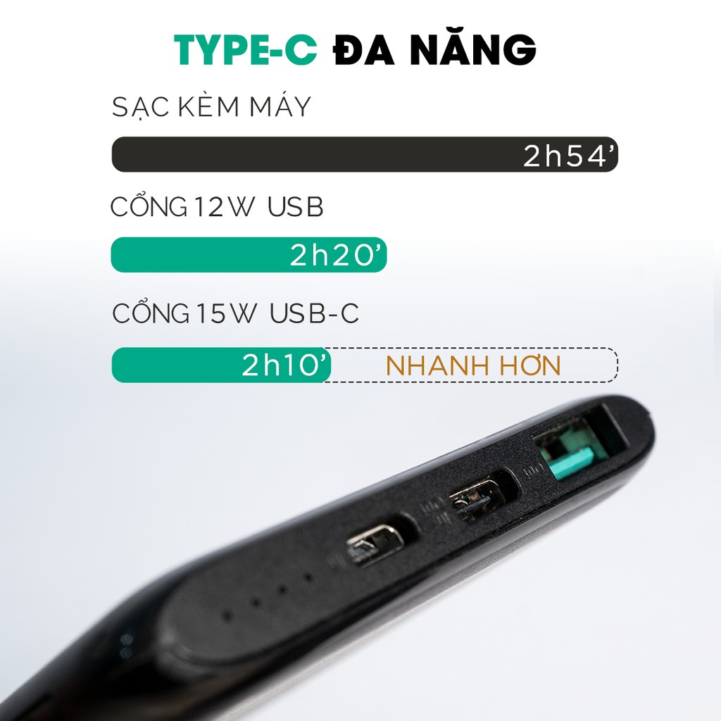 - Sạc 1 cổng đơn: USB-C (15W), USB-A (12W)