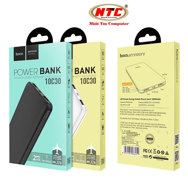 Pin sạc dự phòng Hoco J26 Simple energy 10000mAh - 2 cổng sạc - Hãng Phân Phối Chính Thức1. Dung lượng: 10000mAh / 37Wh. Dung lượng định mức: 6000mAh (5V TYP 2.1A).