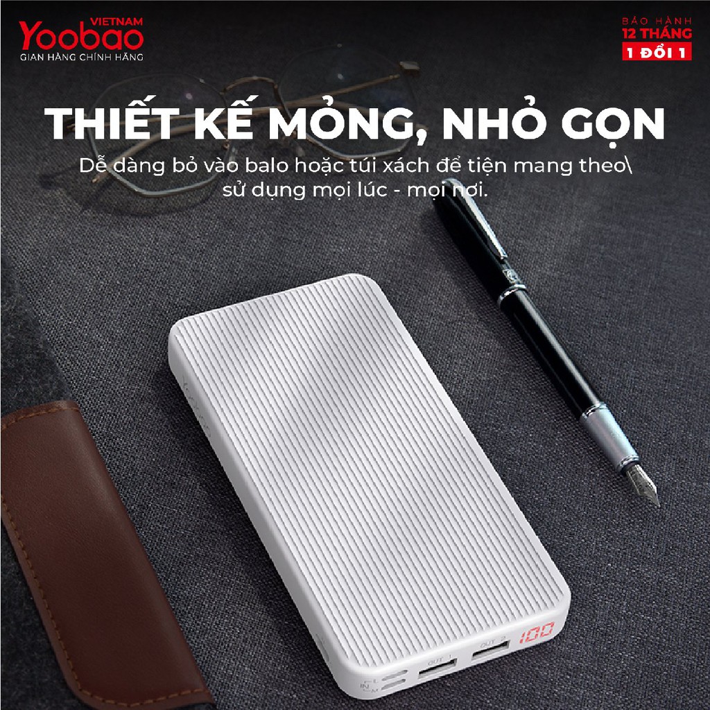 Sạc dự phòng 10000mAh Yoobao P10D sở hữu thiết kế mỏng và nhỏ gọn giúp người dùng có thể dễ dàng bỏ vào balo hoặc túi xách để tiện mang theo sử dụng mọi lúc - mọi nơi. Với dung lượng 20000mAh giúp bạn thoải mái sử dụng mà không lo điện thoại hết pin.