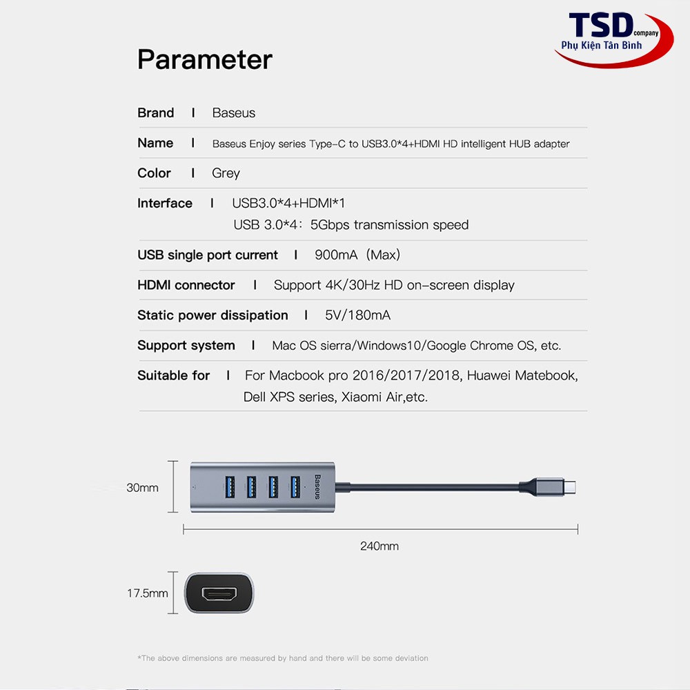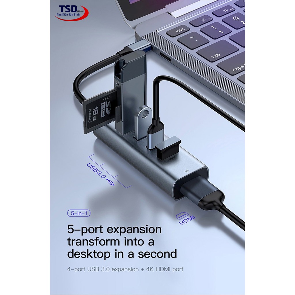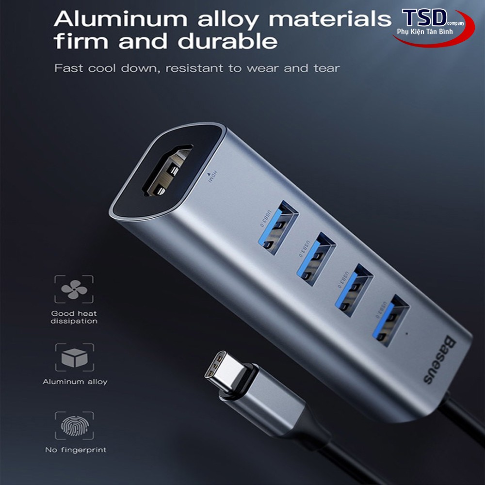 - Bộ Hub chuyển đổi 5 trong 1 Baseus Enjoy Series Type C to USB 3.0 + HDMI có thiết kế đẹp , nhỏ gọn, sang trọng . Bề mặt bằng kim loại màu xám bạc được sơn tỉnh điện cao cấp chống bám vân tay . Thiết kế tinh tế, sang trọng và đẳng cấp.