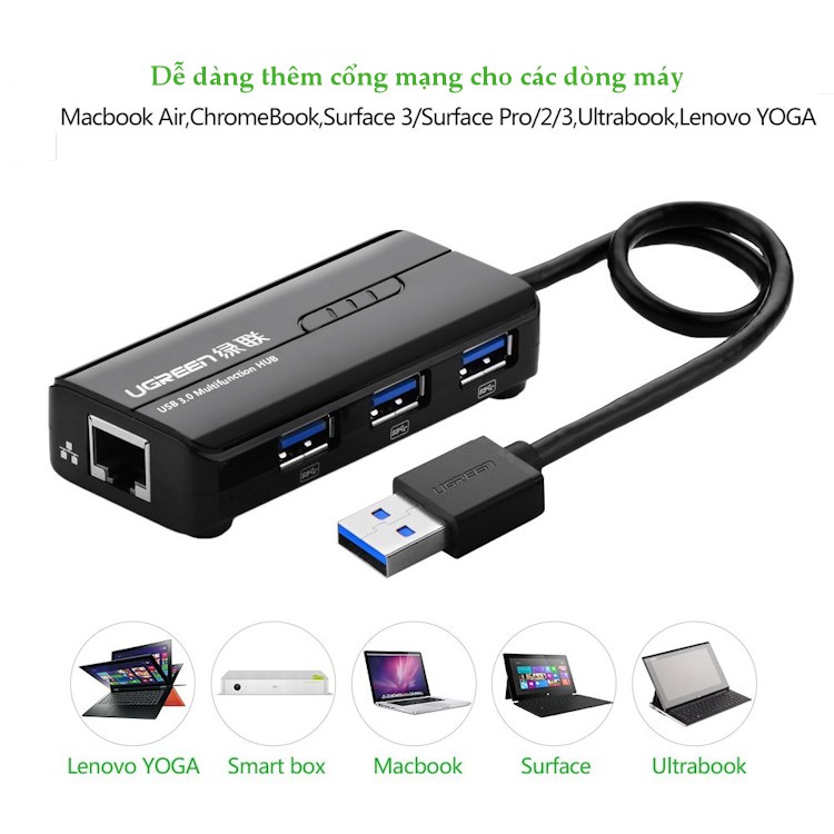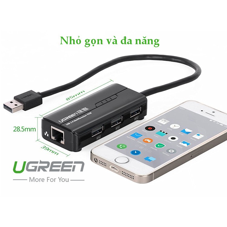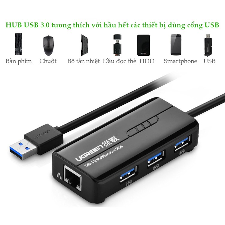 HUB USB 3 cổng 3.0 kèm cổng mạng LAN 10/100/1000 Mbps UGREEN CR103 20265 - Hàng phân phối chính hãng - Bảo hành 18 thángHub USB 3.0 mở rộng cho bạn thêm 3 khe cắm tốc độ cao lên tới 5Gb/s