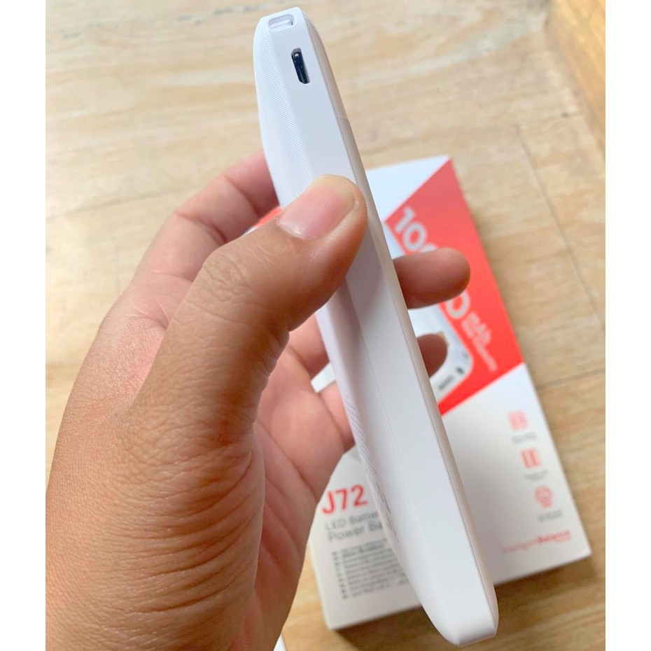 - Sạc dự phòng Hoco J72 dung lượng 10000mAh, công suất tiêu thụ khi sạc đạt 70%, có thể sạc đầy từ 2-2,5 lần cho điện thoại dung lượng pin 3000mAh (như iPhone XS Max hoặc Samsung S10 Plus) khoảng 4 lần cho dòng máy pin dưới 2000 mAh như Iphone 6