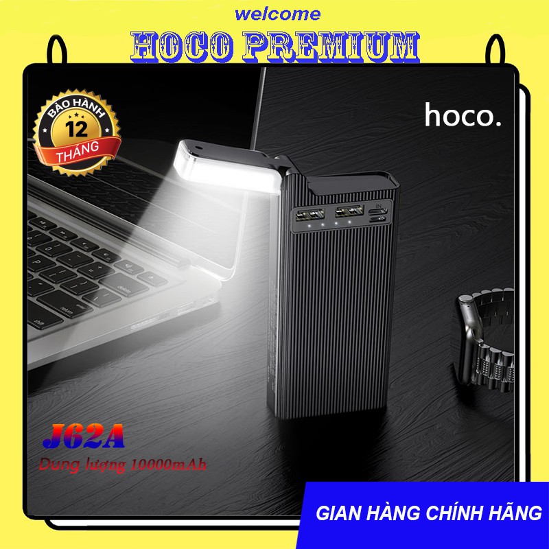SẠC DỰ PHÒNG HOCO J62A / 10000MAH - CHÍNH HÃNGSạc dự phòng Hoco J62A dung lượng 10000mAh, đặc biệt có thêm đèn LED để đọc sách, công suất tiêu thụ, tiêu hao khi sạc đạt 70%, có thể sạc đầy từ 2-2,5 lần cho điện thoại dung lượng pin 3000mAh (như iPhone XS Max hoặc Samsung S10 Plus) tích hợp 2 cổng ra USB, 2 cổng vào MicroUSB và Type C để cắm điện cho SDP này, trên J62A có đèn LED hiển thị vạch pin. J62A sạc cho tất cả các thiết bị điện thoại Smartphone và máy tính bảng.