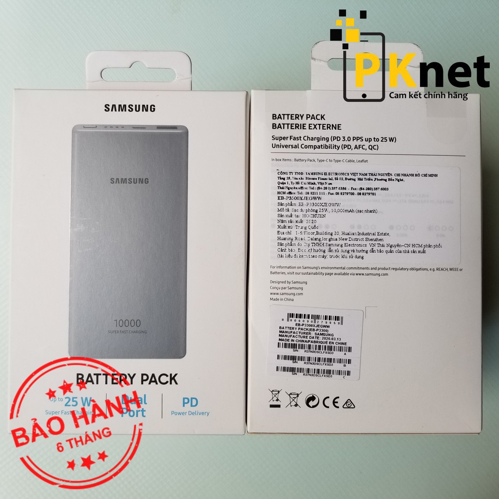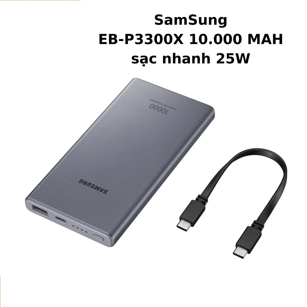 - Nhằm mang lại một độ bền bỉ cùng khả năng sạc nhanh với dung lượng pin lớn. Samsung đã cho ra mắt một sản phẩm sạc dự phòng là pin dự phòng SamSung EB-P3300X 10.000 mAh sạc nhanh 25W chính hãng với nhiều công nghệ đảm bảo độ an toàn cùng khả năng sạc nhanh 25W siêu tốc.
