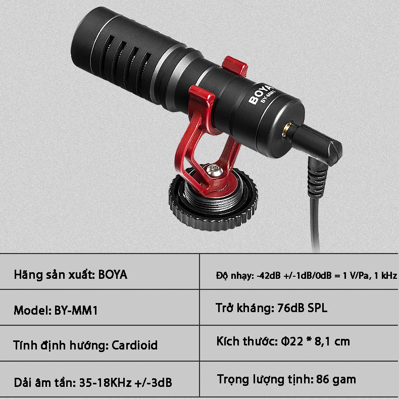 - Micro máy ảnh BOYA BY-MM1 có dải tần đáp ứng âm thanh rất rộng, từ 35Hz tới 18kHz, độ nhạy cao và hướng thu cardioid cho phép tái tạo âm thanh hoàn chỉnh.