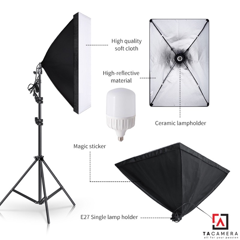 TA Camera: Bộ Kit E27 Kèm Softbox 60x90cm + Chân Đèn 2m (Chân nhỏ) + Bóng Đèn LED Siêu Sáng 50W+ Thích hợp để sử dụng cho các loại đèn ánh sáng liên tục chuẩn đuôi E27, công suất <= 200W. Chuyên Dụng Để Chụp Sản Phẩm.