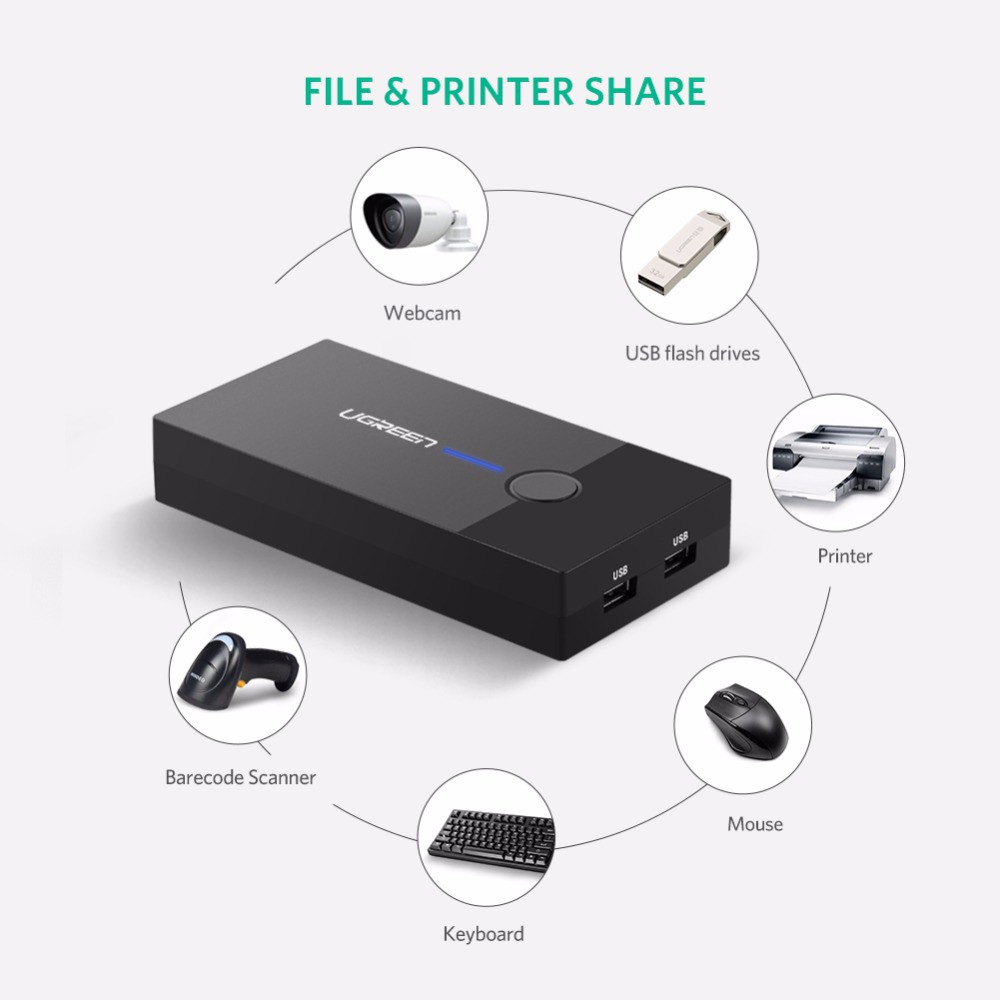 ộ gộp KVM 2 PC sang 1 Màn hình Ugreen 30357KVM switch USB Ugreen 30357cho phép bạn điều khiển hai máy tính bằng một bàn phím duy nhất USB, USB chuột và màn hình, mà nó là tuyệt vời cho những người đã làm việc với nhiều máy tính một cách hiệu quả, tiết kiệm tiền bạc và giải phóng không gian máy tính để bàn. Đó là thuận tiện để ngay lập tức chuyển đổi giữa hai máy tính với một phím nóng bàn phím hoặc dưới cùng chọn.