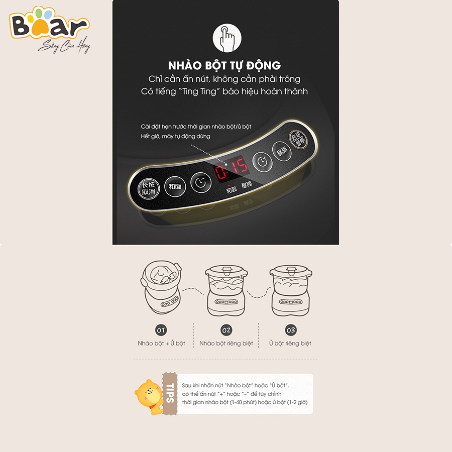 Chức năng hẹn giờ với các nấc thời gian ủ và nhào người dùng có thể lựa chọn hẹn giờ sao cho phù hợp với mỗi loại bánh