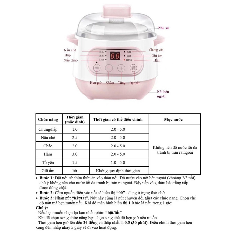 ✔ Có 6 tính năng : hấp, hầm canh, nấu cháo, chưng yến, súp chè, giữ ấm.