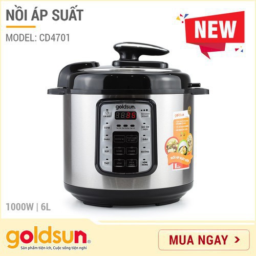 - Nồi áp suất điện tử đa năng GOLDSUN CD4701 với công suất lớn 1000W cùng nhiều chế độ nấu khác nhau, giúp bạn có thể nấu được nhiều món như hầm gân, súp, cháo, gà...Với nguyên lý chế biến thực phẩm với áp suất & nhiệt độ cao, #noiapsuat tiết kiệm tối đa thời gian và năng lượng, giữ nhiệt độ ổn định với hiệu quả giữ ấm hơn 80% và tiết kiệm tới 30% điện năng so với nồi cơm điện bình thường