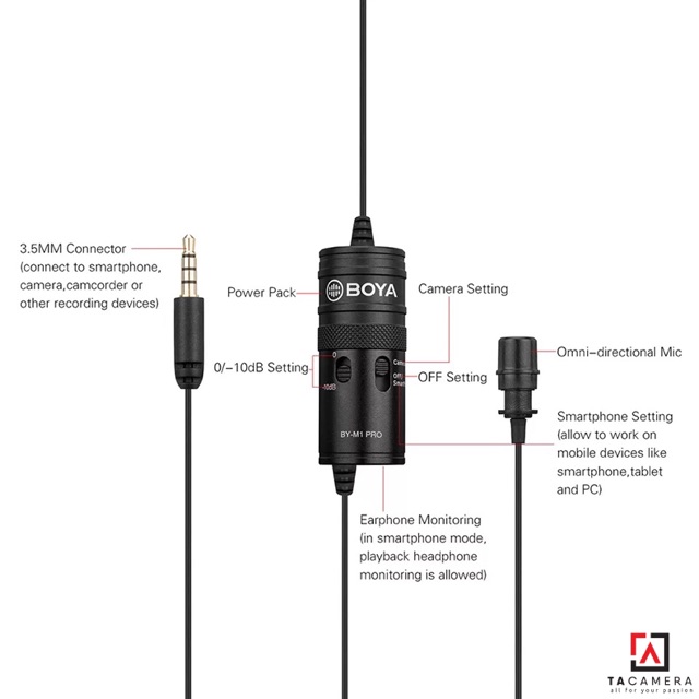 Trên thân máy nhỏ gọn của nó, có một vài chức năng đặc biệt và hữu ích giúp phân biệt BY-M1 Pro với các micro thông thường khác trên thị trường.