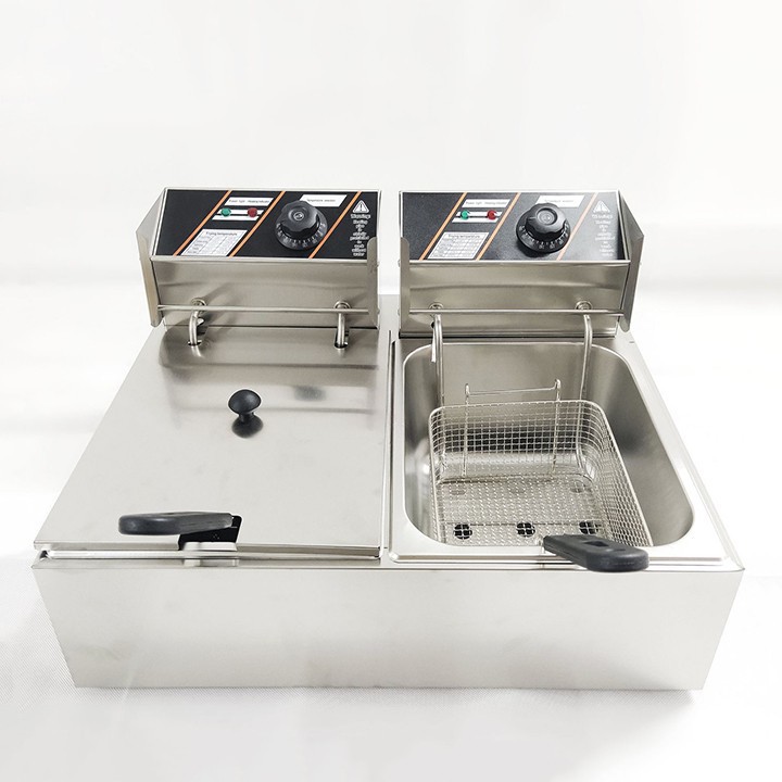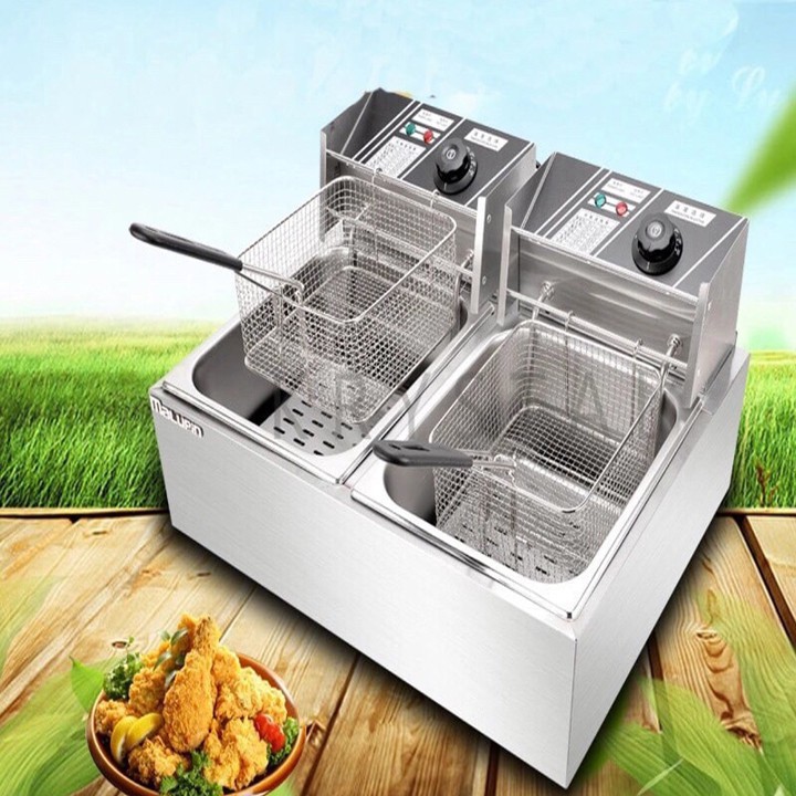 – Bếp chiên nhúng điện đôi 2 giỏ 6X2 lít: bếp chiên khoai tây, chiên gà, đùi gà, cánh gà, xúc xích, thịt bò... Bếp chiên đa năng thiết kế bằng inox không rỉ, có thể tháo rời dễ dàng thuận lợi cho vệ sinh.