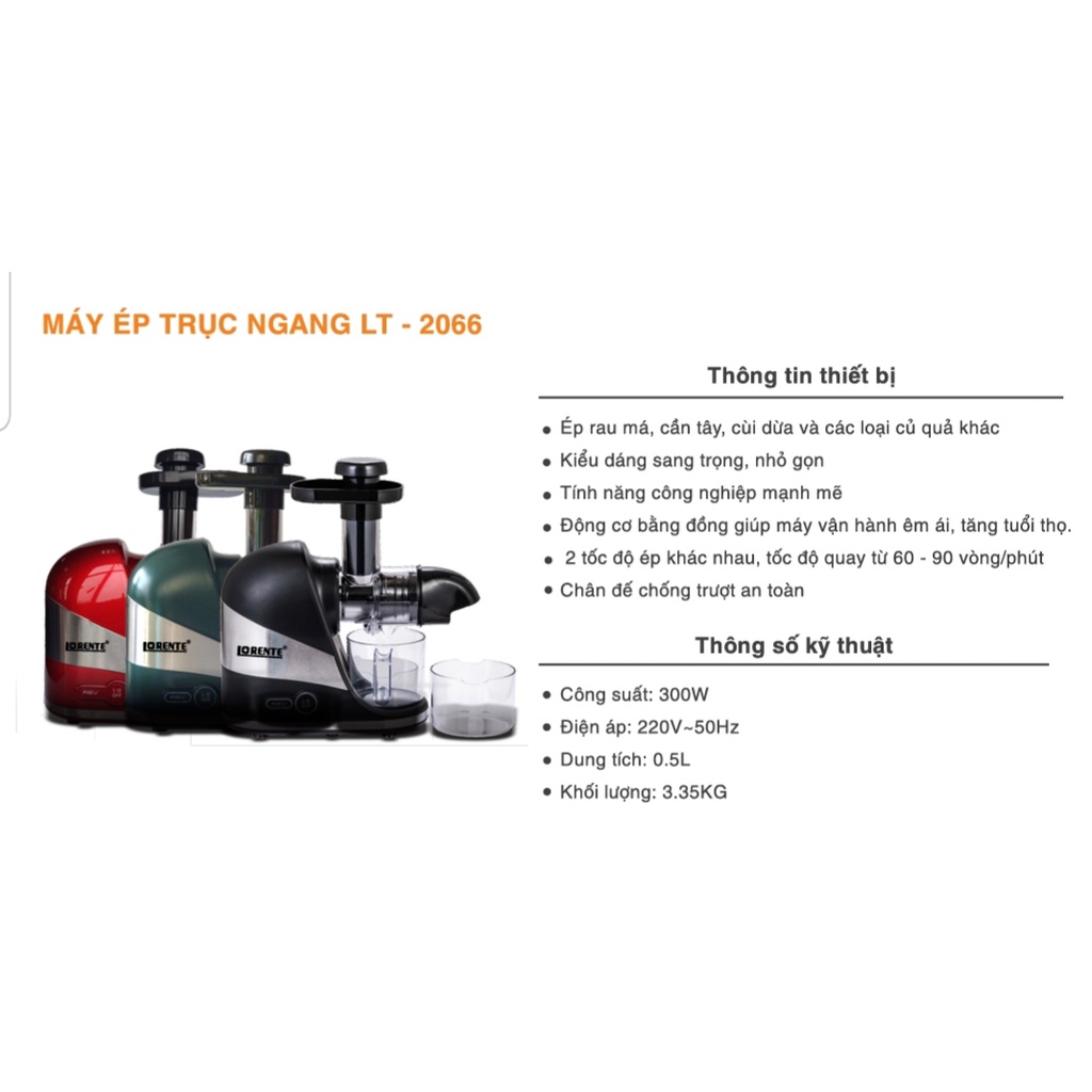 Giới thiệu [Mã ELHA22 giảm 5% đơn 300K] (Mã CHUTHI56 giảm 10K) Máy Ép Chậm Đa Năng Lorente LT-2066 - Hàng chính hãng
