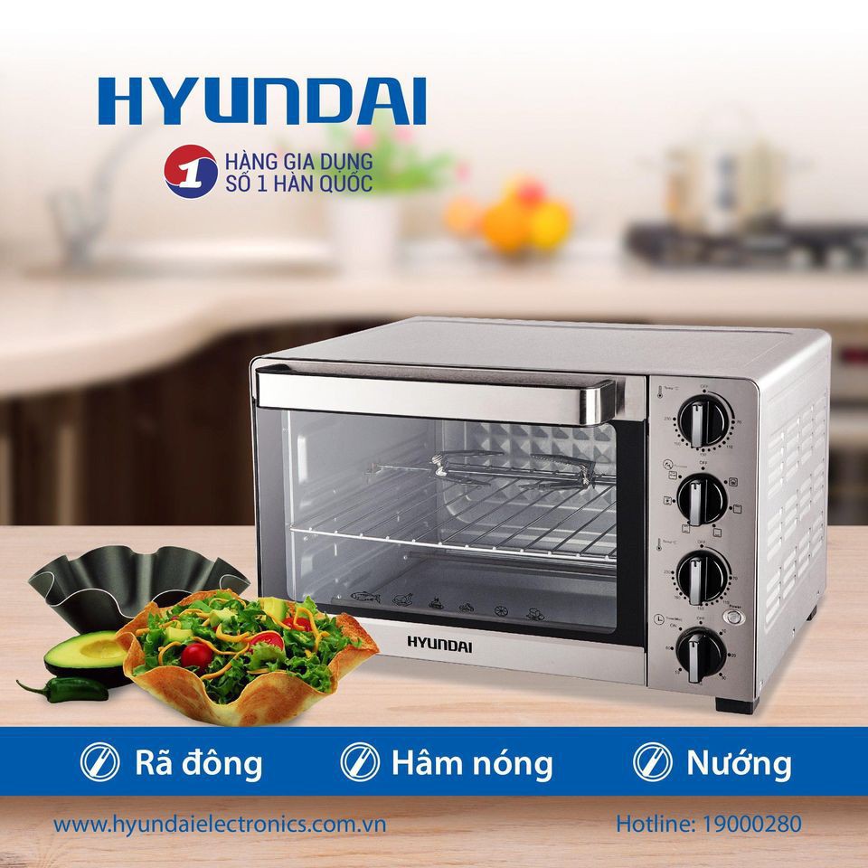Sản phẩm chăm sóc nhà bếp Hyundai mang đến thành công không chỉ bởi khả năng hỗ trợ công việc nấu nướng mà còn bằng sự hiểu biết sâu sắc về nhu cầu ẩm thực và bày trí không gian nhà bếp của khách hàng.Bằng chức năng nướng xiên quay và quạt đối lưu phân bố nhiệt đều khắp buồng nướng, lò nướng Hyundai giúp món nướng chín rất đều và vàng ươm một cách tự động trong lúc bạn chuẩn bị nước chấm. Bên cạnh đó, với dung tích buồng nướng 45 lít cùng công suất 2000W, lò nướng Hyundai không chỉ cho phép nướng hầu hết các loại thịt từ bò, gà đến cá mà còn nướng được bánh Pizza, khoai tây và nhiều loại bánh khác.