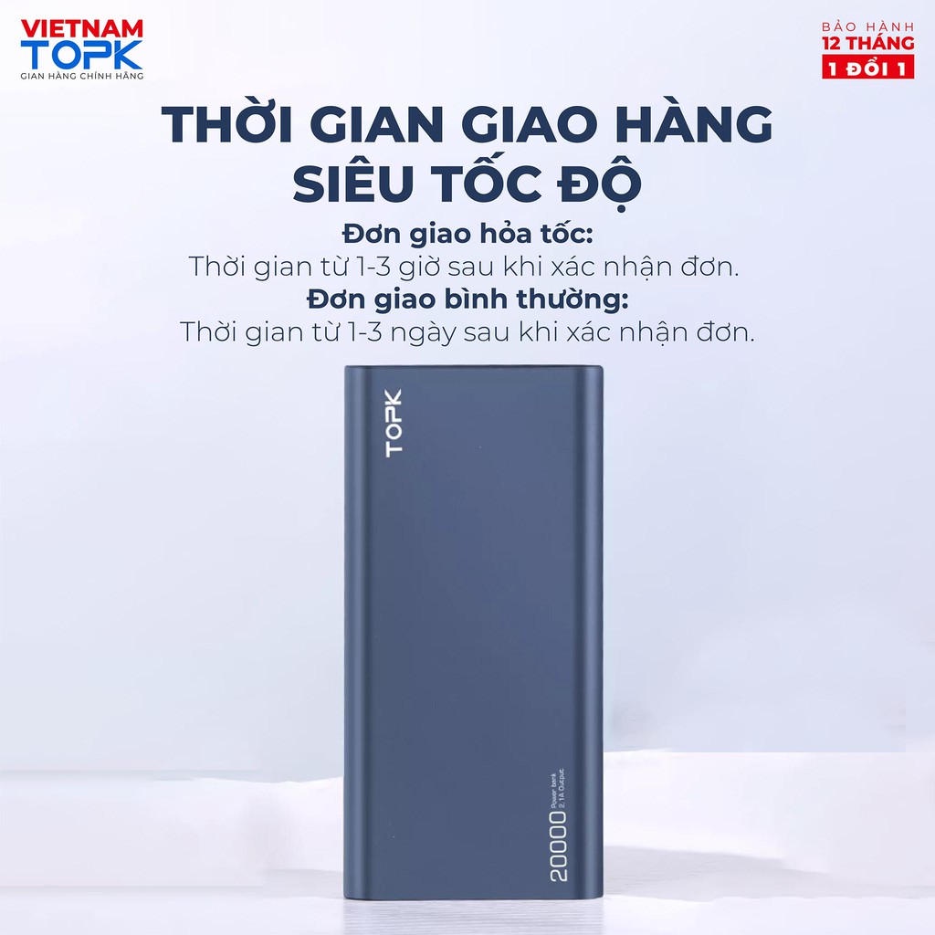 Sạc dự phòng 20000mAh TOPK I2006P Sạc nhanh PD QC 3.0 18W 3 đầu raTHỜI GIAN GIAO HÀNG SIÊU TỐC ĐỘ