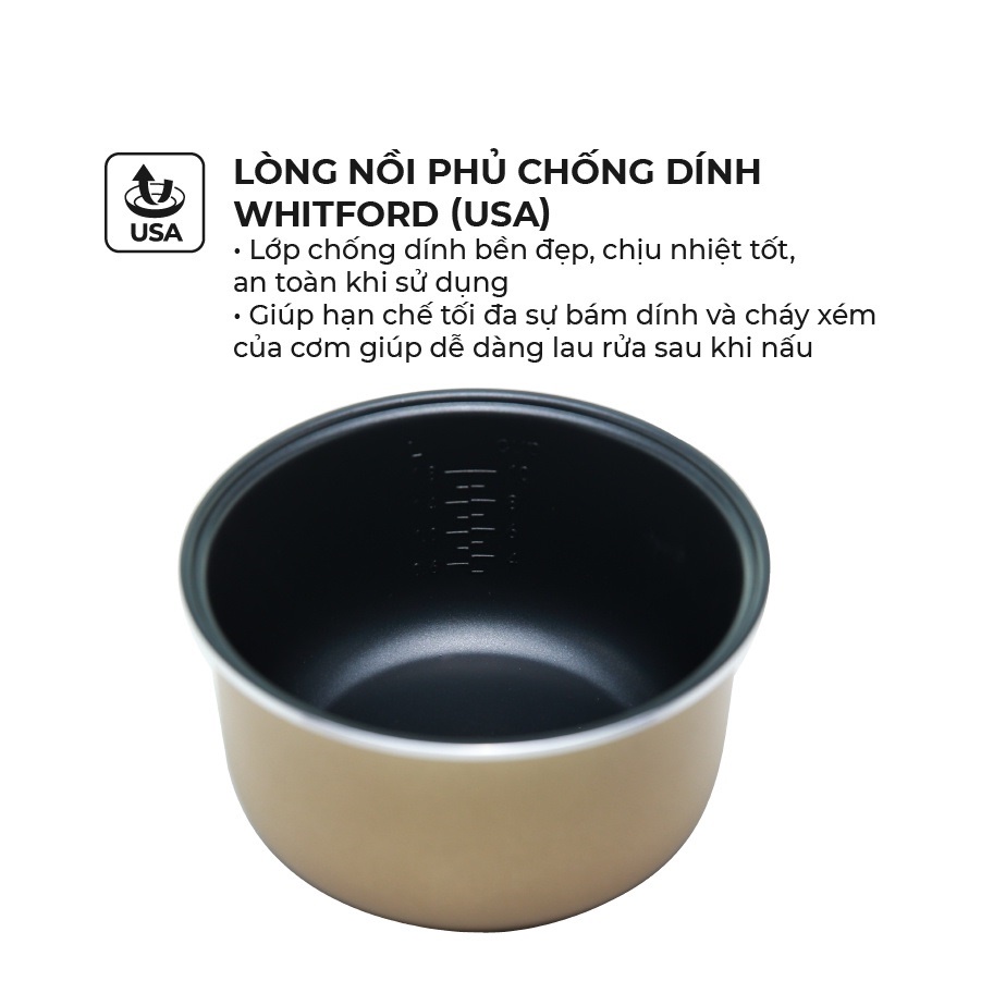 Ngoài ra, nồi được trang bị vạch đo mực nước trong lòng nồi giúp bạn tính toán và nấu đúng lượng gạo và lượng nước cho cơm chín ngon, đúng ý.