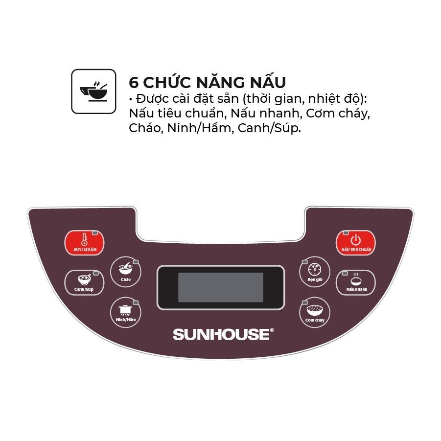 Nồi có 6 chức năng cài đặt sẵn (thời gian, nhiệt độ): Nấu tiêu chuẩn – Nấu nhanh – Cơm cháy – Cháo – Ninh/Hầm – Canh/Súp..